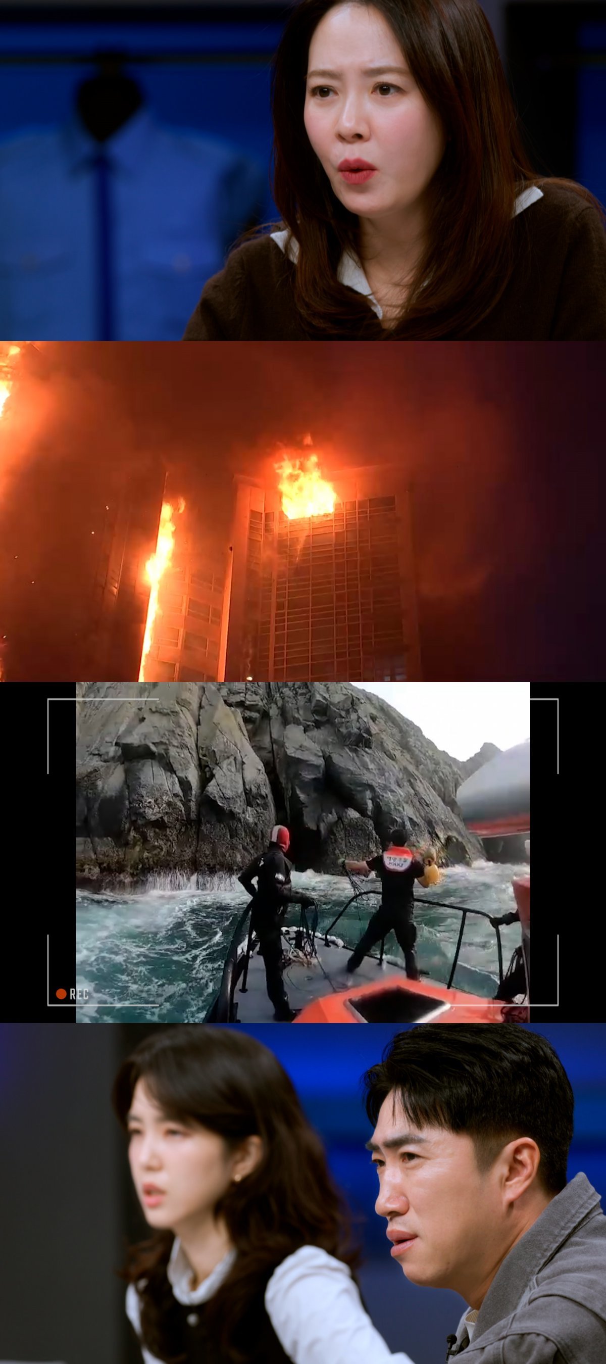 제작진이 공개한 영상에는 늦은 밤 울산의 한 고층 아파트에서 발생한 화재가 순식간에 건물 전체로 번지는 모습이 그려진다. 특히 건물 외벽을 타고 치솟는 거대한 불길을 본 송지효는 “화염방사기 쏘는 줄 알았다”며 경악을 금치 못한다.