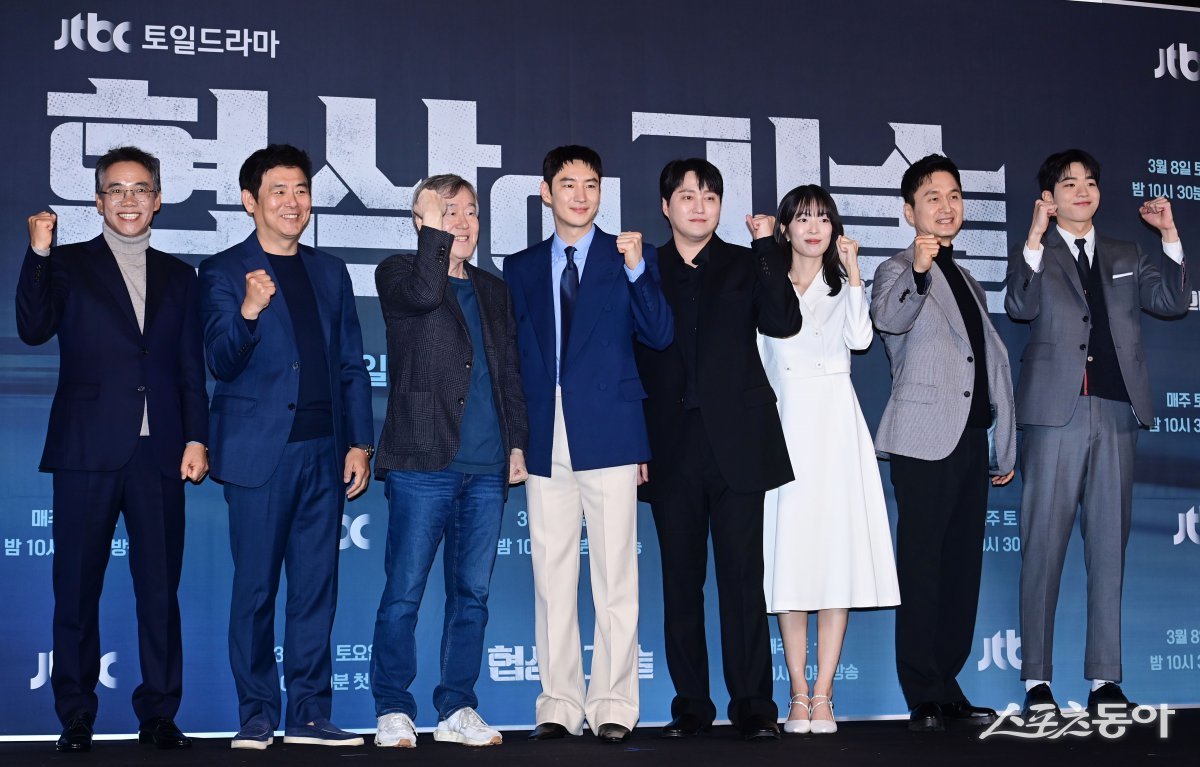 배우 오만석, 성동일, 안판석 감독, 이제훈, 김대명, 안현호, 장현성, 차강윤이 6일 서울 구로구 라마다서울신도림호텔에서 열린 JTBC 새 토일드라마 ‘협상의 기술’ 제작발표회에서 포즈를 취하고 있다. 주현희 기자 teth1147@donga.com