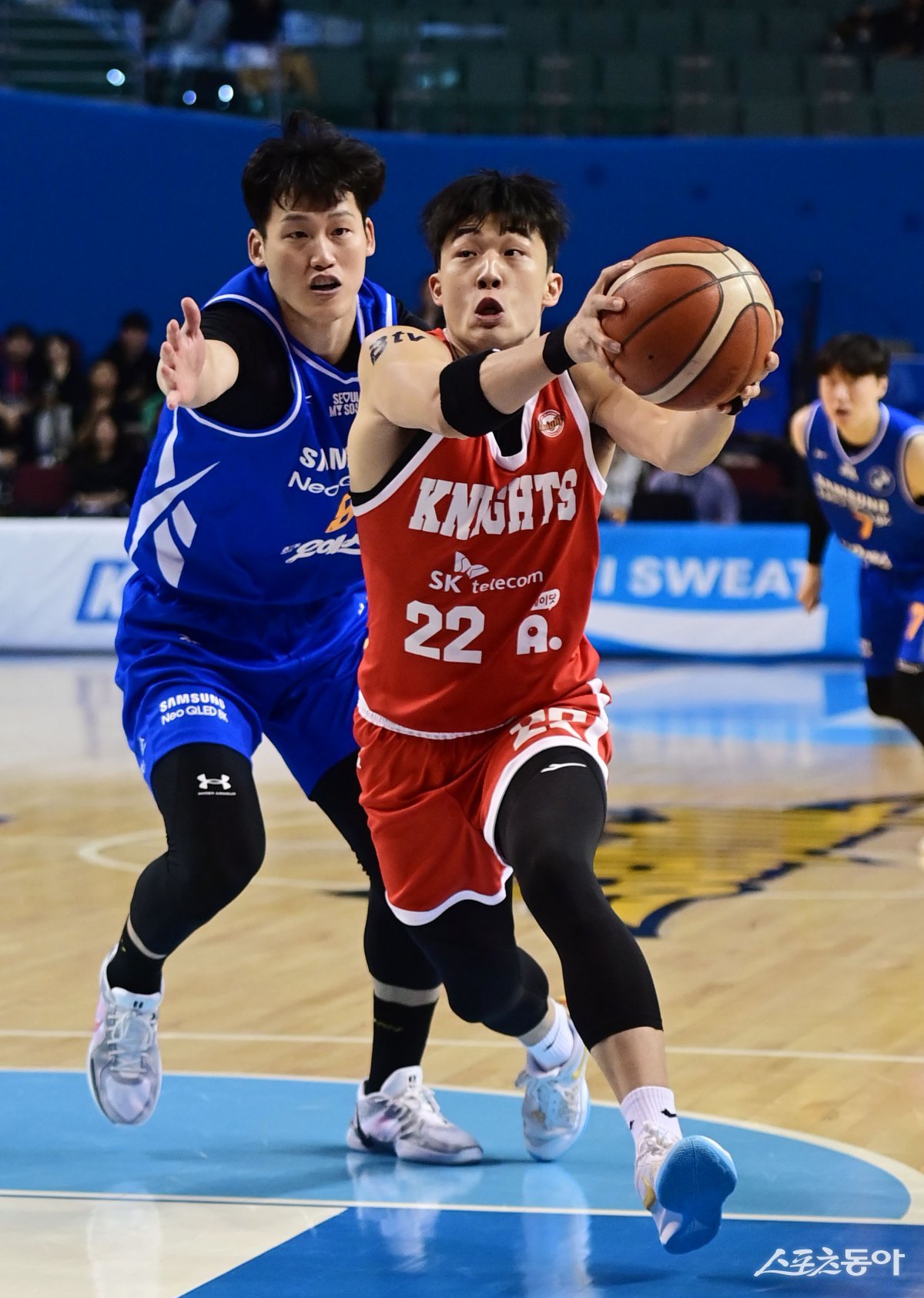 SK 오재현(앞)이 5일 잠실체육관에서 열린 삼성과 원정경기 도중 공격을 시도하고 있다. 잠실|주현희 기자 teth1147@donga.com