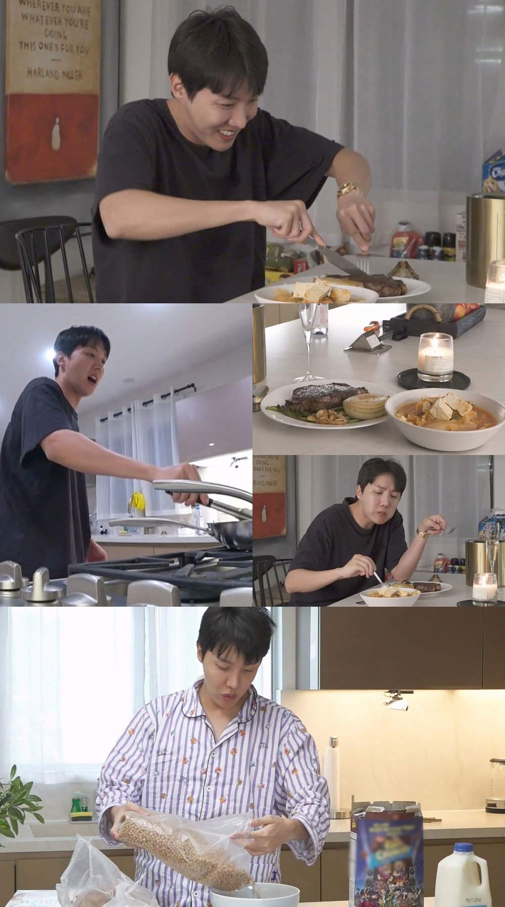 또한 다음 날 어김없이 모닝 사과로 아침을 연 제이홉은 ‘군대식 시리얼 레시피’를 공개한다. 그는 “군대에서는 다 섞어 먹어요”라며 커다란 대접에 시리얼 4종을 털어 넣는다. 이어 달걀 프라이로 단백질 보충까지, 끝날 듯 끝나지 않는 브런치 타임을 즐긴다고.