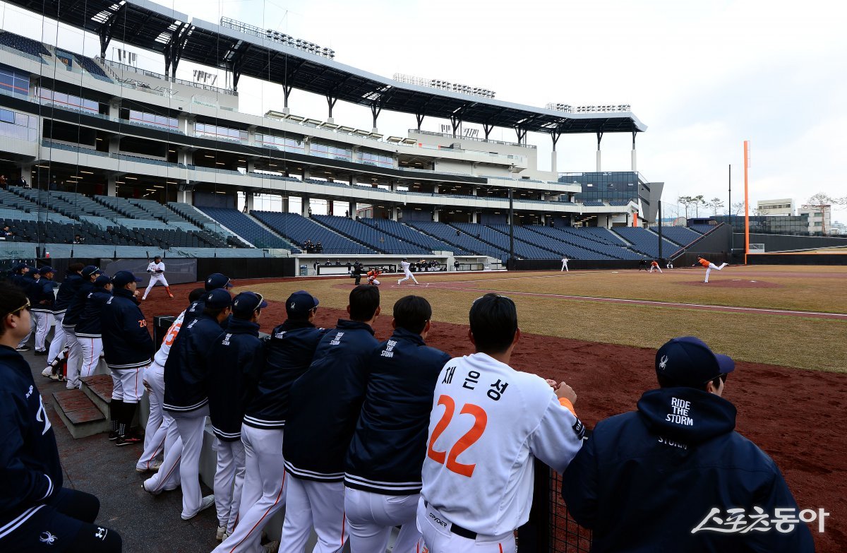 6일 대전 한화생명볼파크에서 한화 이글스의 청백전 경기가 열렸다. 시범경기에 앞서 한화 선수들이 새로운 구장에서 경기를 펼치고 있다. 대전 | 김민성 기자 marineboy@donga.com