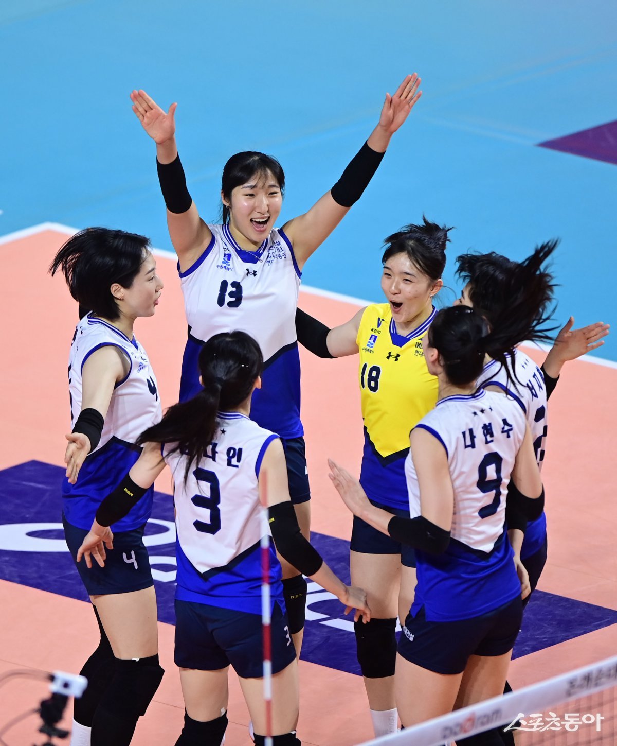 양 팀 모두 정규리그 동안 웜업존을 지키며 묵묵히 기회를 기다린 백업들을 대거 투입한 가운데 현대건설의 에너지가 더 강했다. 날개 공격수 정지윤이 블로킹 5개와 서브 2개를 곁들인 25점을 터트렸고, 미들블로커 이다현도 13점을 보탰다.