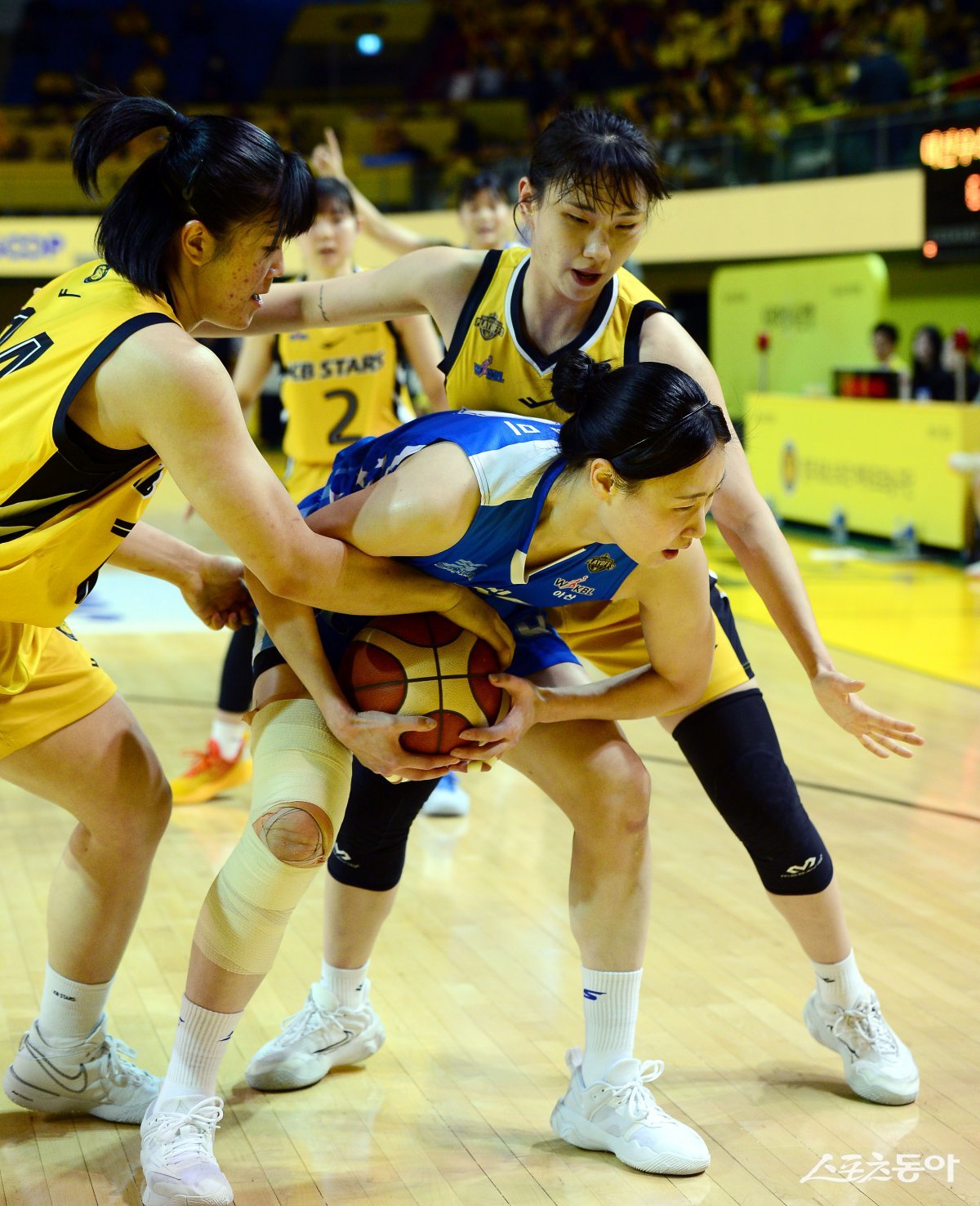 6일 충북 청주체육관에서 열린 ‘하나은행 2024-2025 여자프로농구’ KB 스타즈와 우리은행의 경기에서 우리은행 박혜미가 KB 수비에 막혀 패스 할 곳을 찾고 있다. 청주 | 김민성 기자 marineboy@donga.com