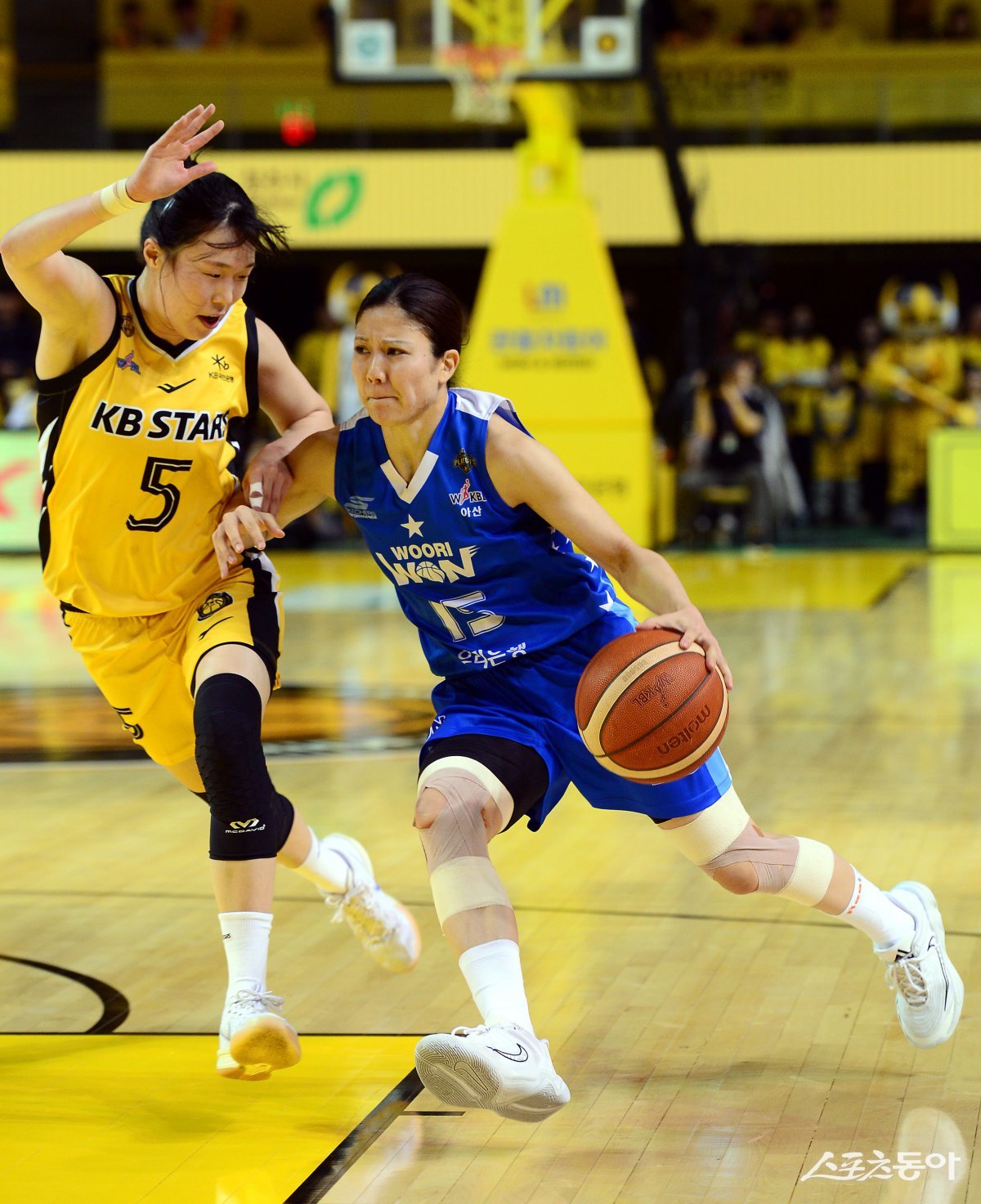 6일 충북 청주체육관에서 열린 ‘하나은행 2024-2025 여자프로농구’ KB 스타즈와 우리은행의 경기에서 우리은행 나츠키가 KB 양지수의 수비를 피해 돌파를 시도하고 있다. 청주 | 김민성 기자 marineboy@donga.com