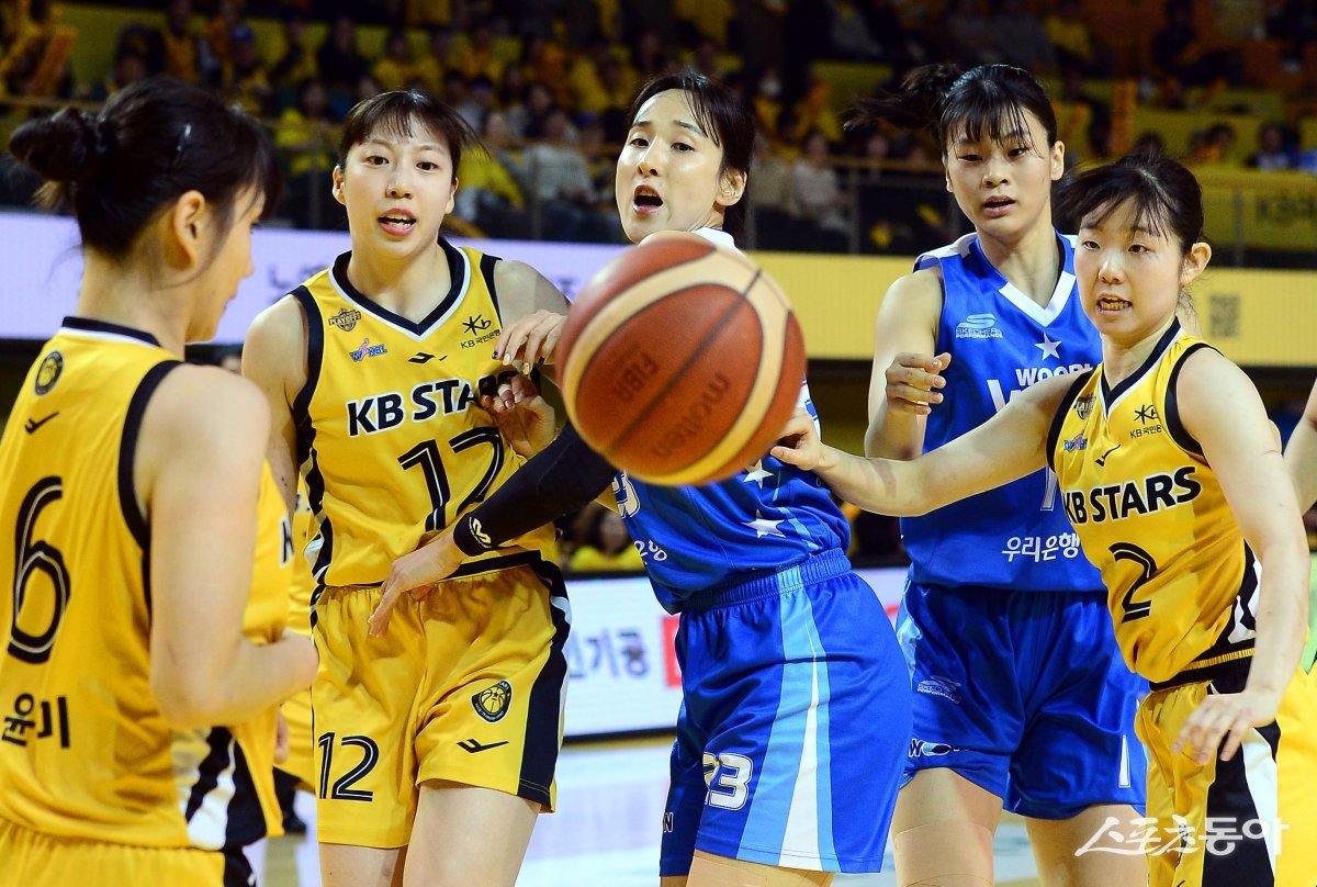 6일 충북 청주체육관에서 열린 ‘하나은행 2024-2025 여자프로농구’ KB 스타즈와 우리은행의 경기에서 우리은행 김단비와 KB 나가타 모에가 볼을 바라보고 있다. 청주 | 김민성 기자 marineboy@donga.com
