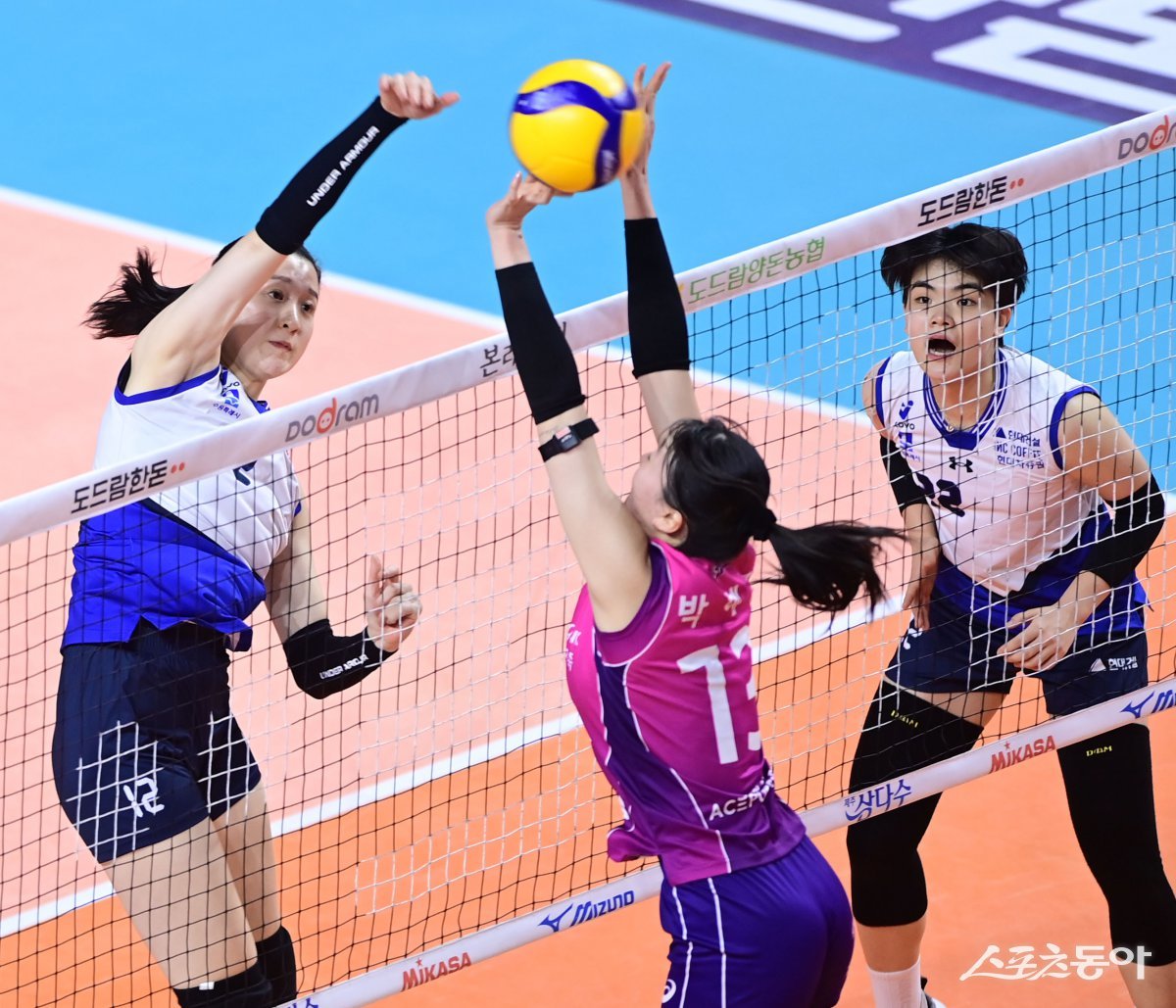 6일 인천삼산월드체육관에서 열린 ‘도드람 2024-2025 V리그’ 여자부 흥국생명과 현대건설의 경기에서 현대건설 이다현이 흥국생명 블로커 앞에서 스파이크를 하고 있다. 인천 | 주현희 기자 teth1147@donga.com