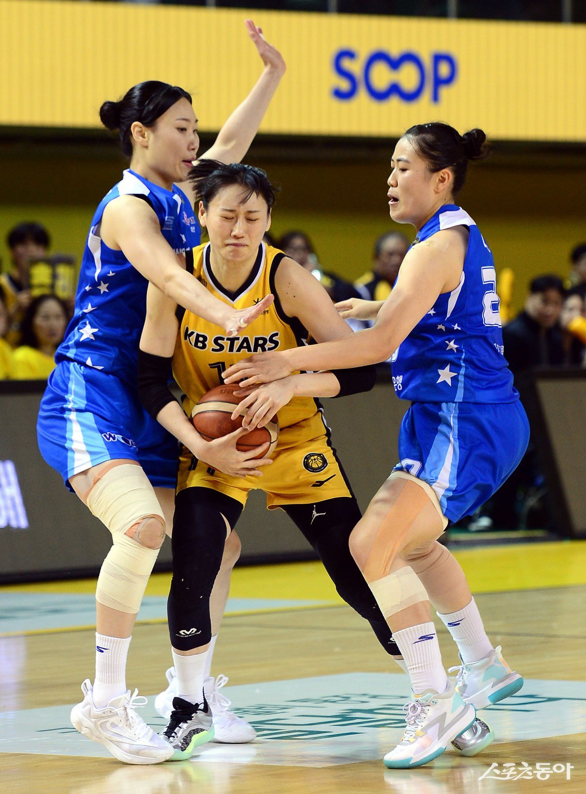6일 충북 청주체육관에서 열린 ‘하나은행 2024-2025 여자프로농구’ KB 스타즈와 우리은행의 PO 경기에서 KB 강이슬이 우리은행 수비에 막혀 고전하고 있다. 청주 | 김민성 기자 marineboy@donga.com