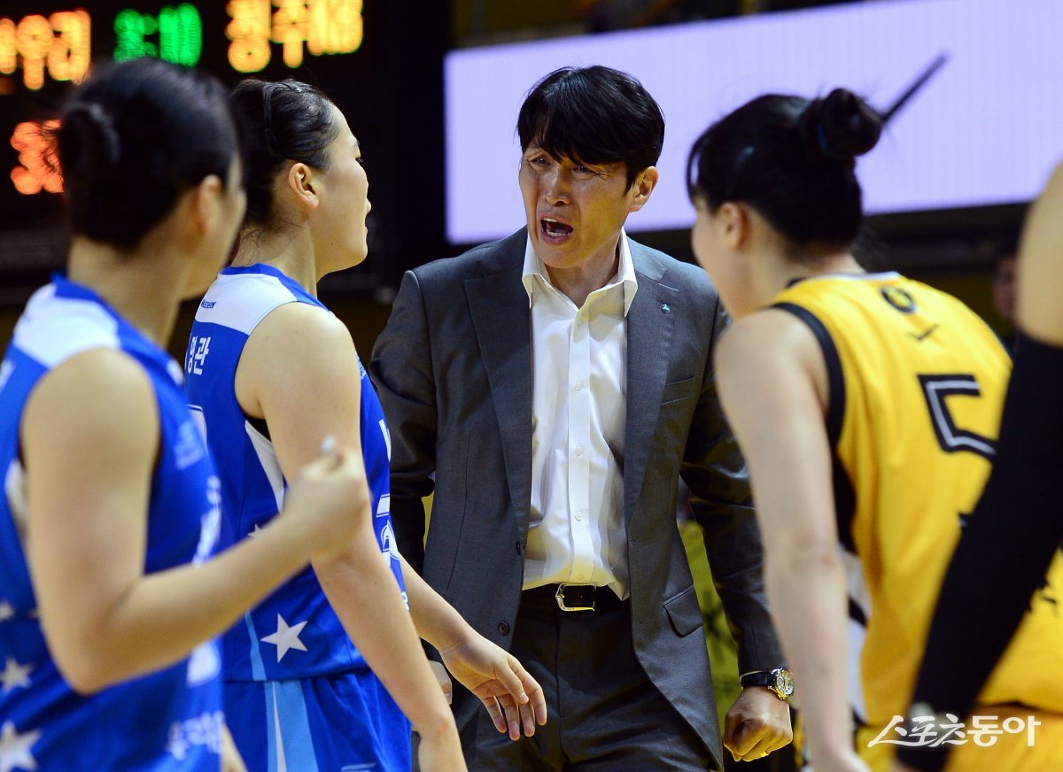 6일 충북 청주체육관에서 열린 ‘하나은행 2024-2025 여자프로농구’ KB 스타즈와 우리은행의 PO 경기에서 우리은행 위성우 감독이 작전을 지시하고 있다. 청주 | 김민성 기자 marineboy@donga.com