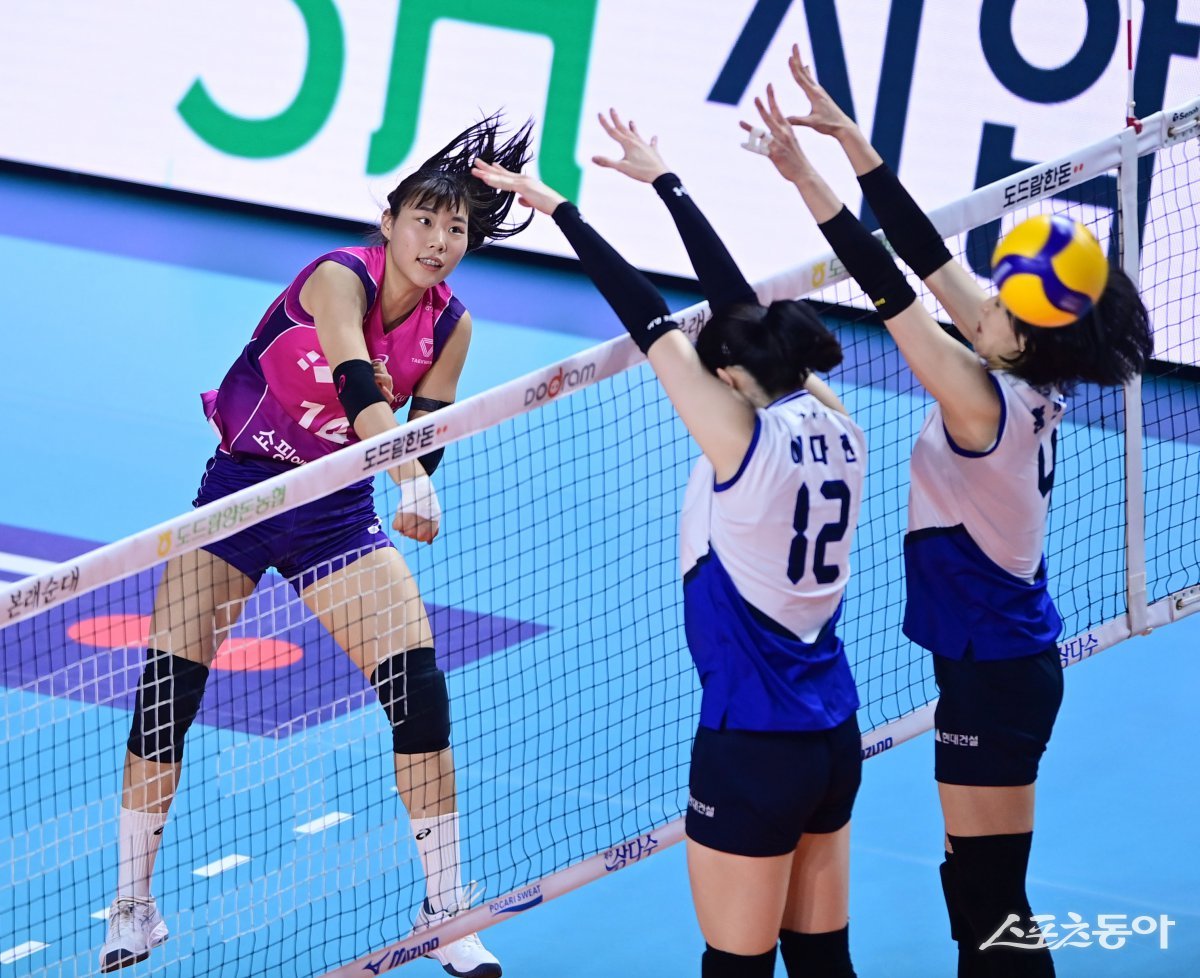 6일 인천삼산월드체육관에서 열린 ‘도드람 2024-2025 V리그’ 여자부 흥국생명과 현대건설의 경기에서 흥국생명 정윤주가 현대건설 블로커 앞에서 스파이크를 하고 있다. 인천 | 주현희 기자 teth1147@donga.com