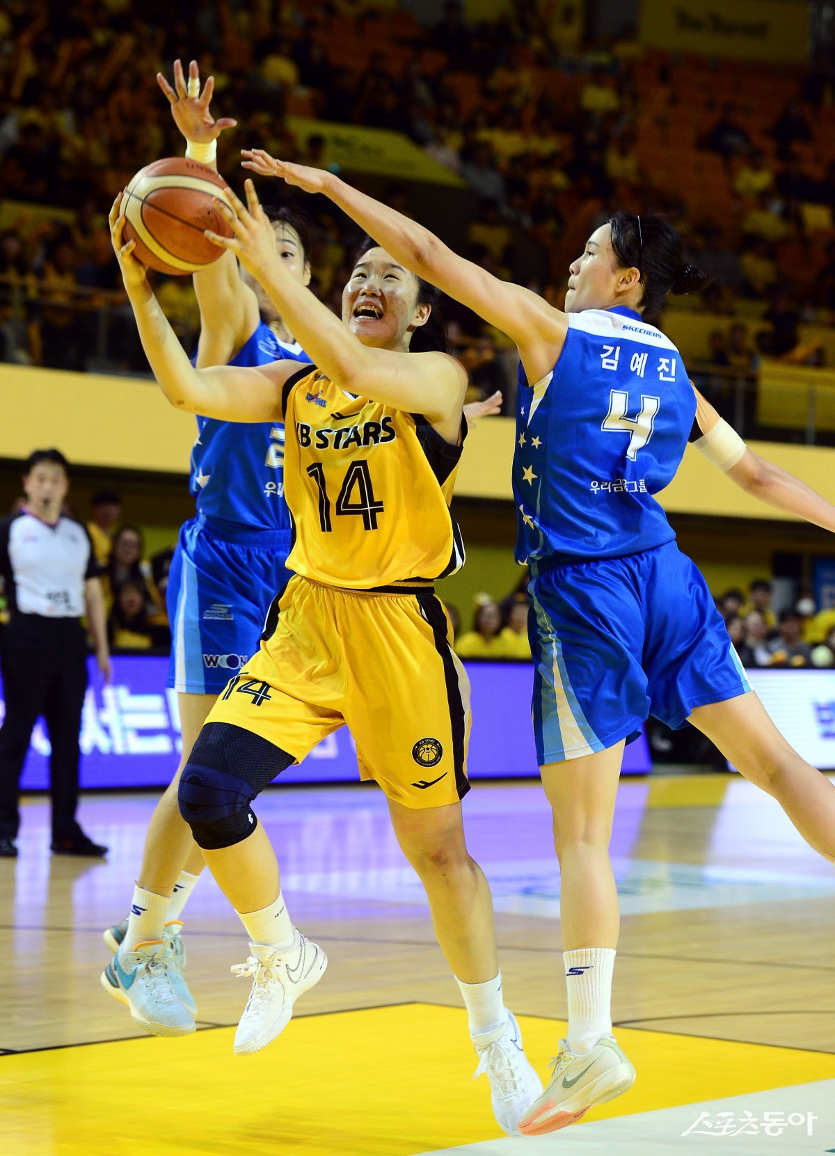 6일 충북 청주체육관에서 열린 ‘하나은행 2024-2025 여자프로농구’ KB 스타즈와 우리은행의 PO 경기에서 KB 송윤하가 우리은행 수비를 피해 슛을 쏘고 있다. 청주 | 김민성 기자 marineboy@donga.com