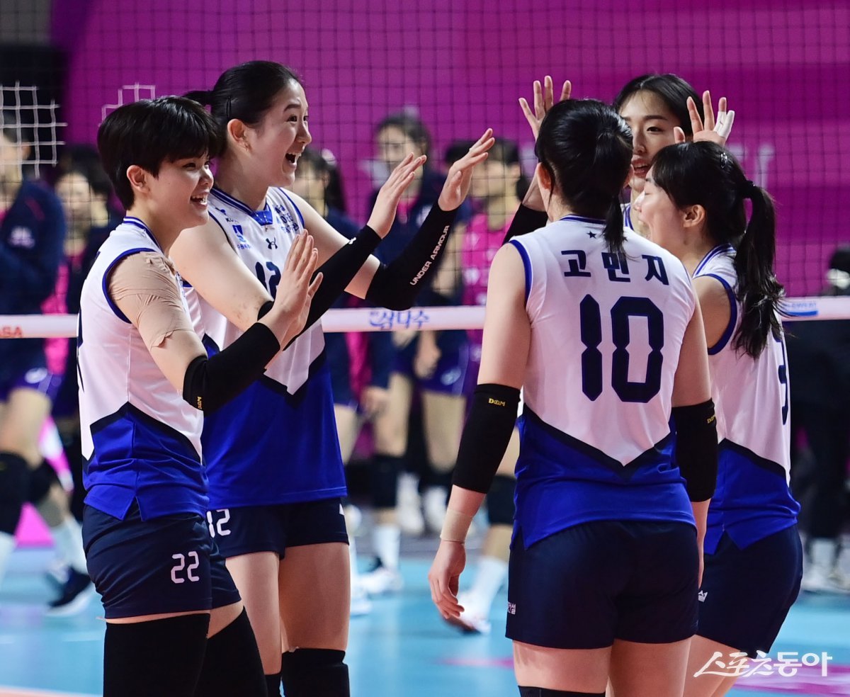 6일 인천삼산월드체육관에서 열린 ‘도드람 2024-2025 V리그’ 여자부 흥국생명과 현대건설의 경기에서 세트스코어 3-1로 승리한 현대건설 선수들이 기쁨을 나누고 있다. 인천 | 주현희 기자 teth1147@donga.com