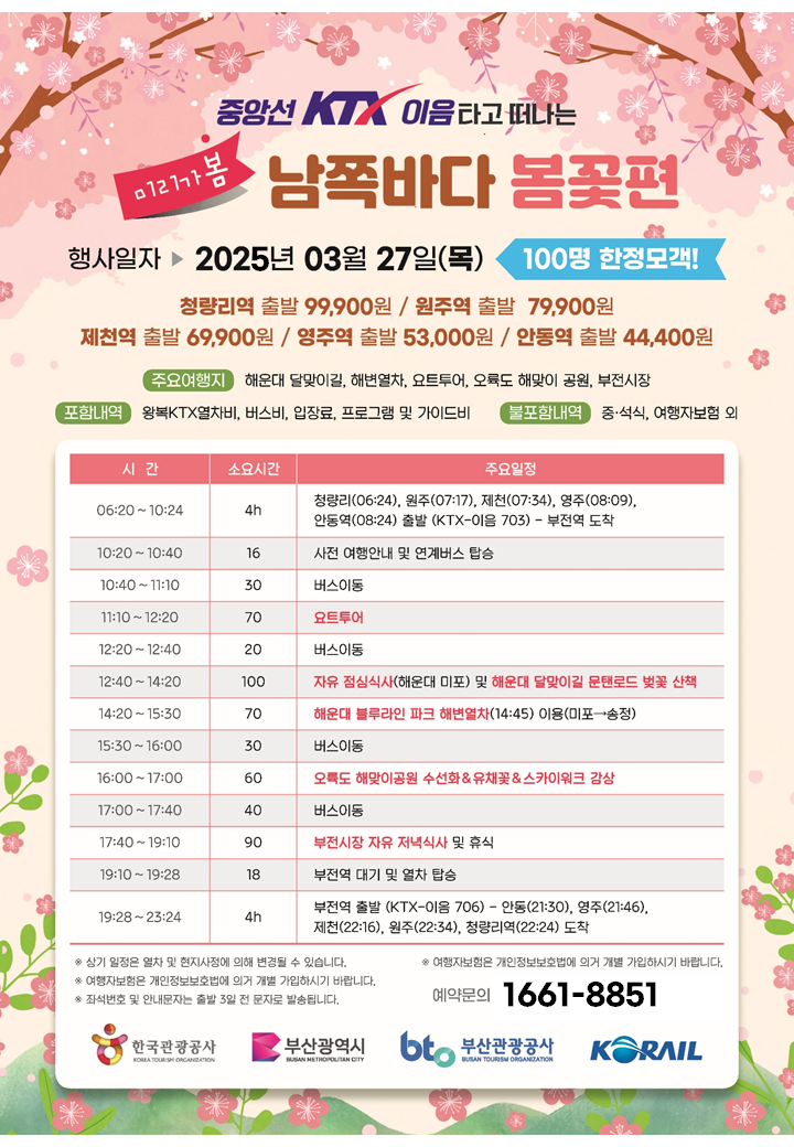 이번 여행상품은 지난해 12월에 개통한 KTX 중앙선(청량리-부전)을 이용하는 상품으로 수도권과 강원권 관광객을 주요 대상으로 했다. 부산의 이른 개화 시기를 활용해 ‘가장 먼저 만나는 봄꽃’을 26일과 27일 각 1회씩 운영한다. 당일 왕복 KTX, 관광지 입장료, 단체 버스 등의 비용을 포함했다.