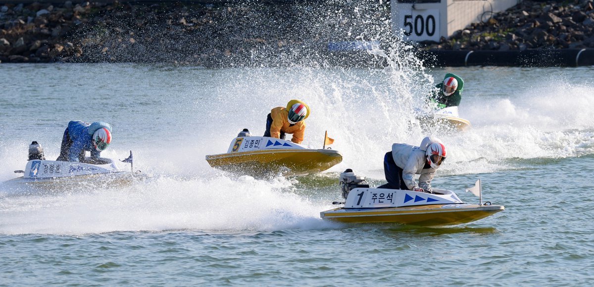 미사리 경정장에서 열린 경정 경주에서 선수들이 턴 마크를 돌며 경합을 벌이고 있다 사진제공|국민체육진흥공단