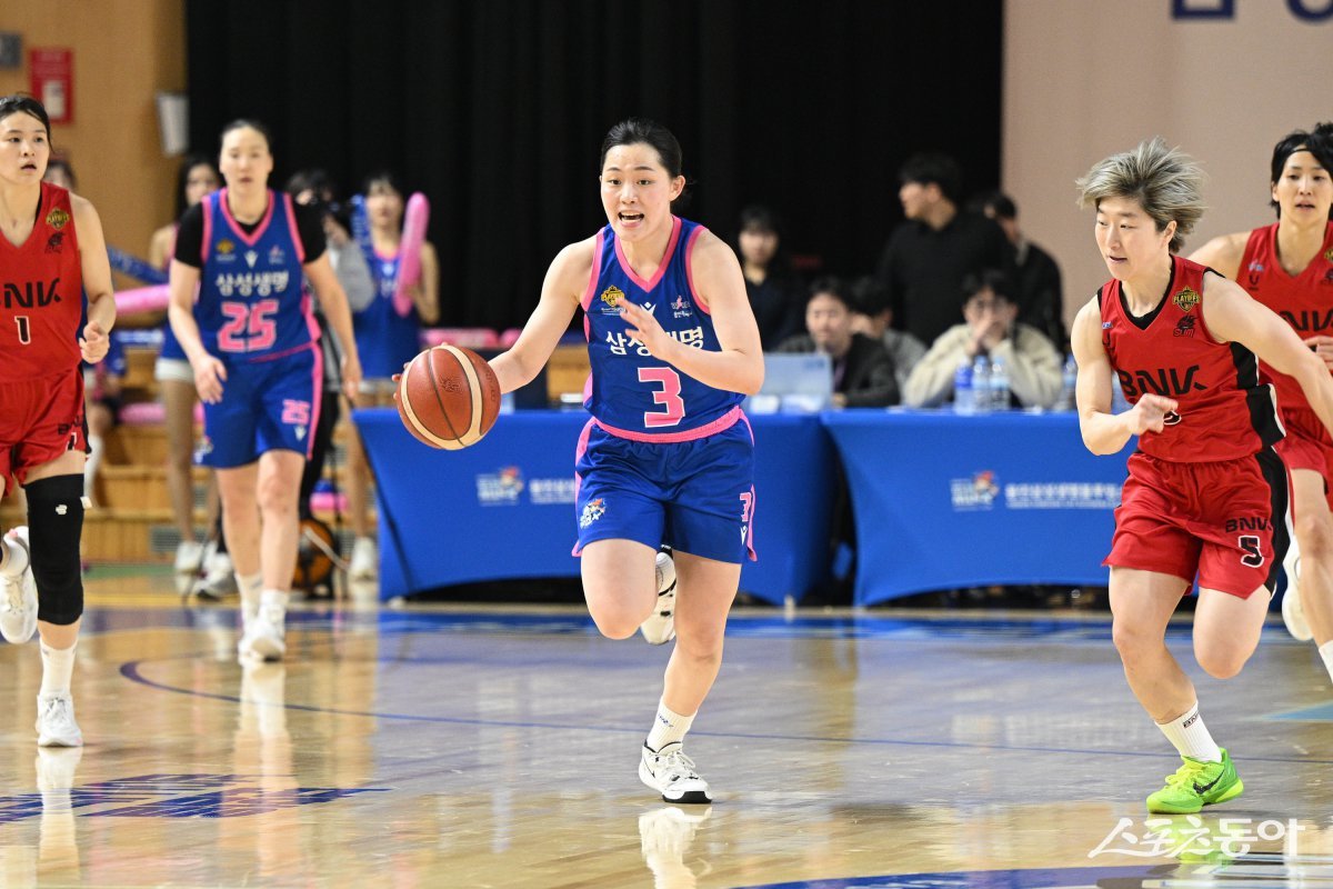 삼성생명은 그 틈을 놓치지 않았다. BNK가 백업 센터 박성진(4점)을 기용했지만, 높이의 장점을 극대화했다. 리바운드를 지배해 공격 횟수를 늘렸고, 11-5로 앞섰다. 그러자 BNK가 1쿼터 종료 1분 전 김소니아를 다시 내보냈다. 부담은 있으나 격차가 더 벌어지는 것을 막으려 했다. 그러나 기세가 오른 삼성생명은 13-6, 7점차로 앞섰다.