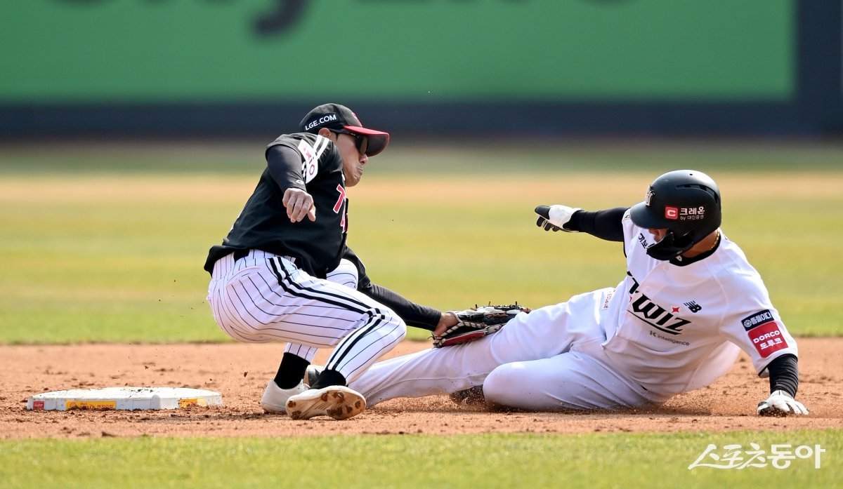 9일 수원KT위즈파크에서 ‘2025 신한은행 SOL뱅크 KBO리그’ 시범경기 LG 트윈스와 KT 위즈 경기가 열렸다. 5회말 2사 1루 KT 1루주자 강현우가 2루 도루를 시도했으나 아웃되고 있다. 수원|김종원 기자 won@donga.com