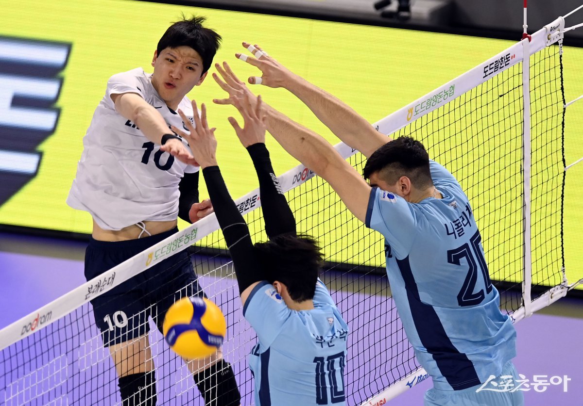 9일 인천 계양체육관에서 ‘도드람 2024-2025 V리그’ 대한항공과 우리카드의 남자부 경기가 열렸다. 대한항공 정지석이 우리카드 블로커를 피해 스파이크를 날리고 있다. 인천 | 김민성 기자 marineboy@donga.com