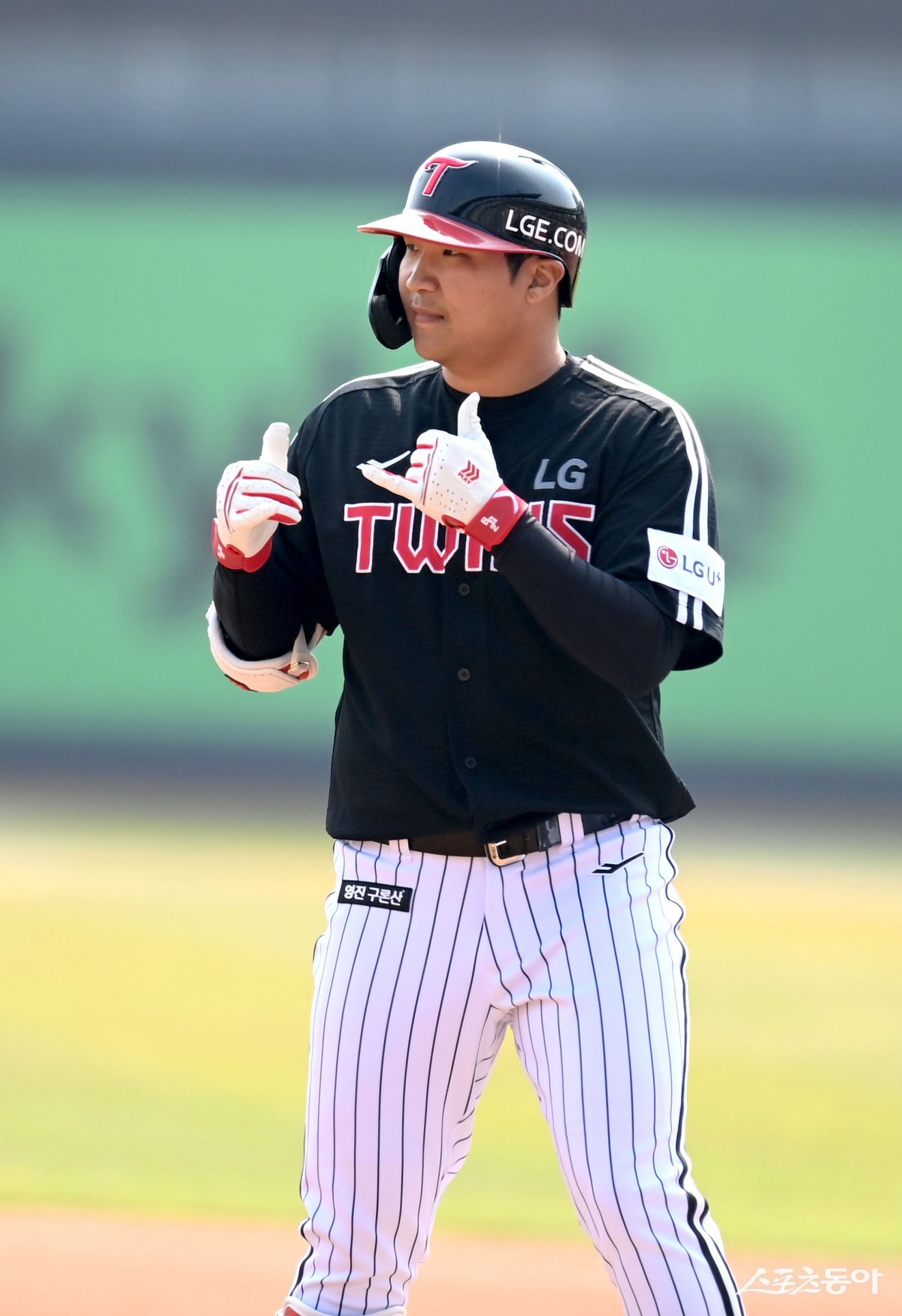9일 수원KT위즈파크에서 ‘2025 신한은행 SOL뱅크 KBO리그’ 시범경기 LG 트윈스와 KT 위즈 경기가 열렸다. 2회초 무사 만루 LG 문보경이 선제 2타점 적시타를 치고 1루에서 기뻐하고 있다. 수원|김종원 기자 won@donga.com