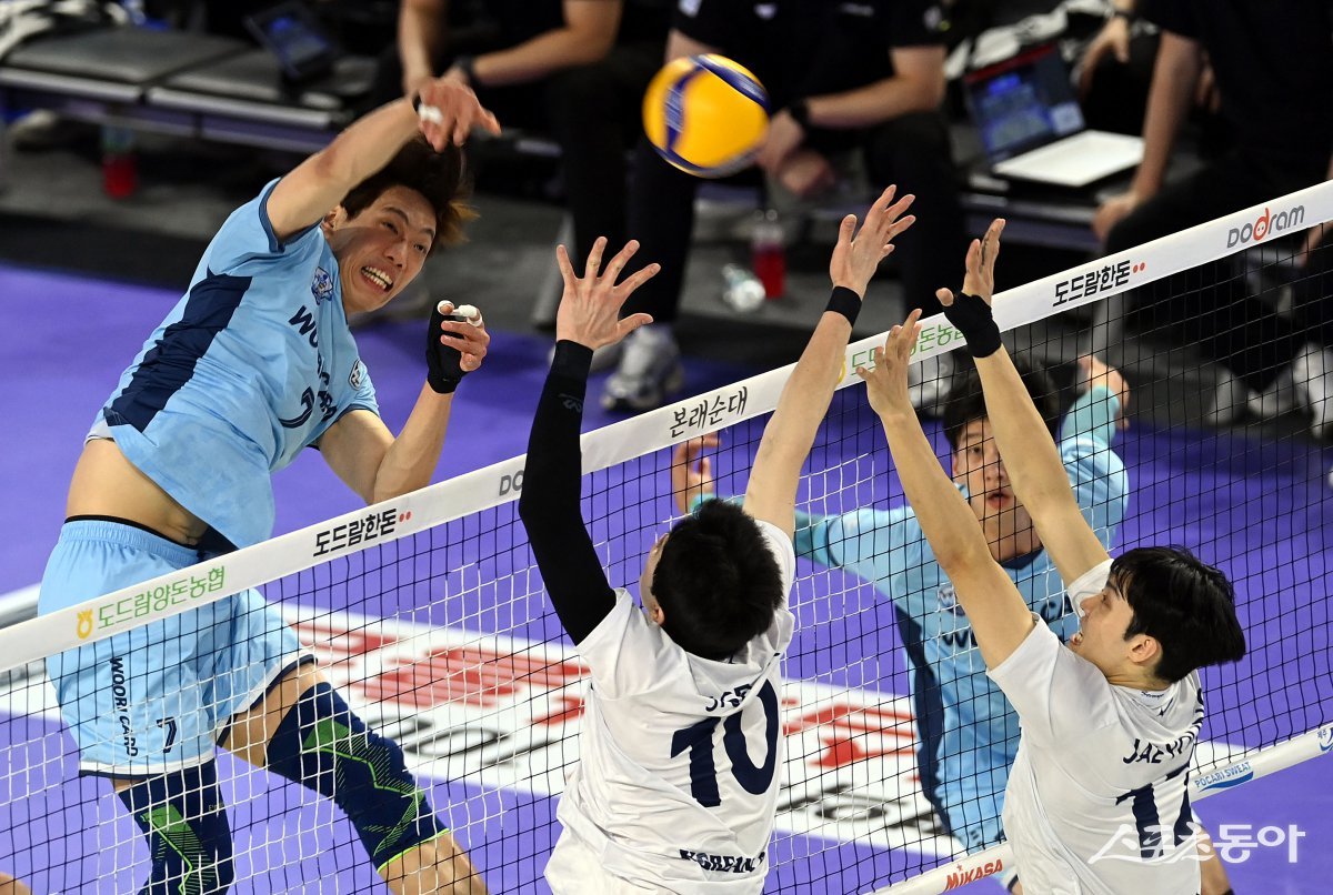 9일 인천 계양체육관에서 ‘도드람 2024-2025 V리그’ 대한항공과 우리카드의 남자부 경기가 열렸다. 우리카드 이상현이 대한항공 블로커를 피해 공격을 펼치고 있다. 인천 | 김민성 기자 marineboy@donga.com