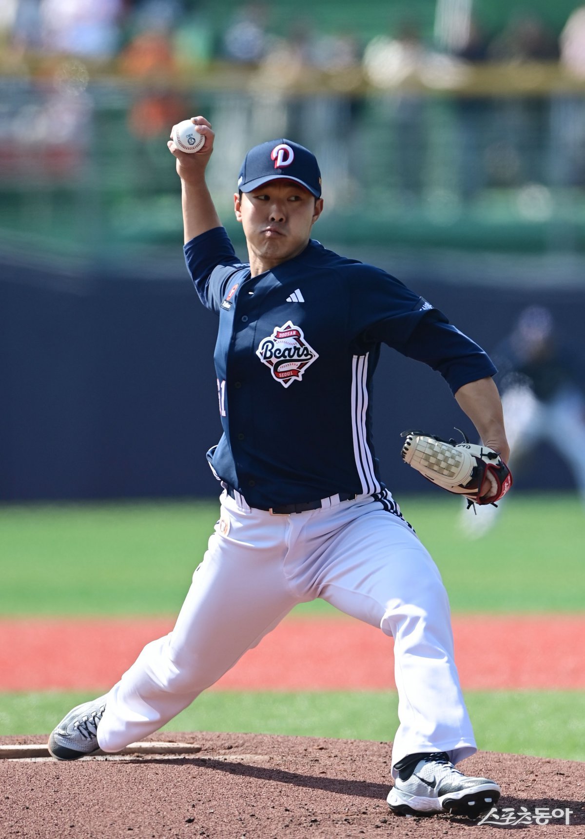 9일 청주야구장에서 열린 ‘2025 신한 SOL Bank KBO리그’ 한화와 두산의 시범경기에서 두산 선발 투수 최원준이 마운드에 올라 역투하고 있다. 청주 | 주현희 기자 teth1147@donga.com