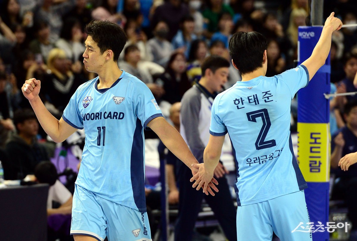 9일 인천 계양체육관에서 ‘도드람 2024-2025 V리그’ 대한항공과 우리카드의 남자부 경기가 열렸다. 우리카드 한성정이 득점 후 환호하고 있다. 인천 | 김민성 기자 marineboy@donga.com
