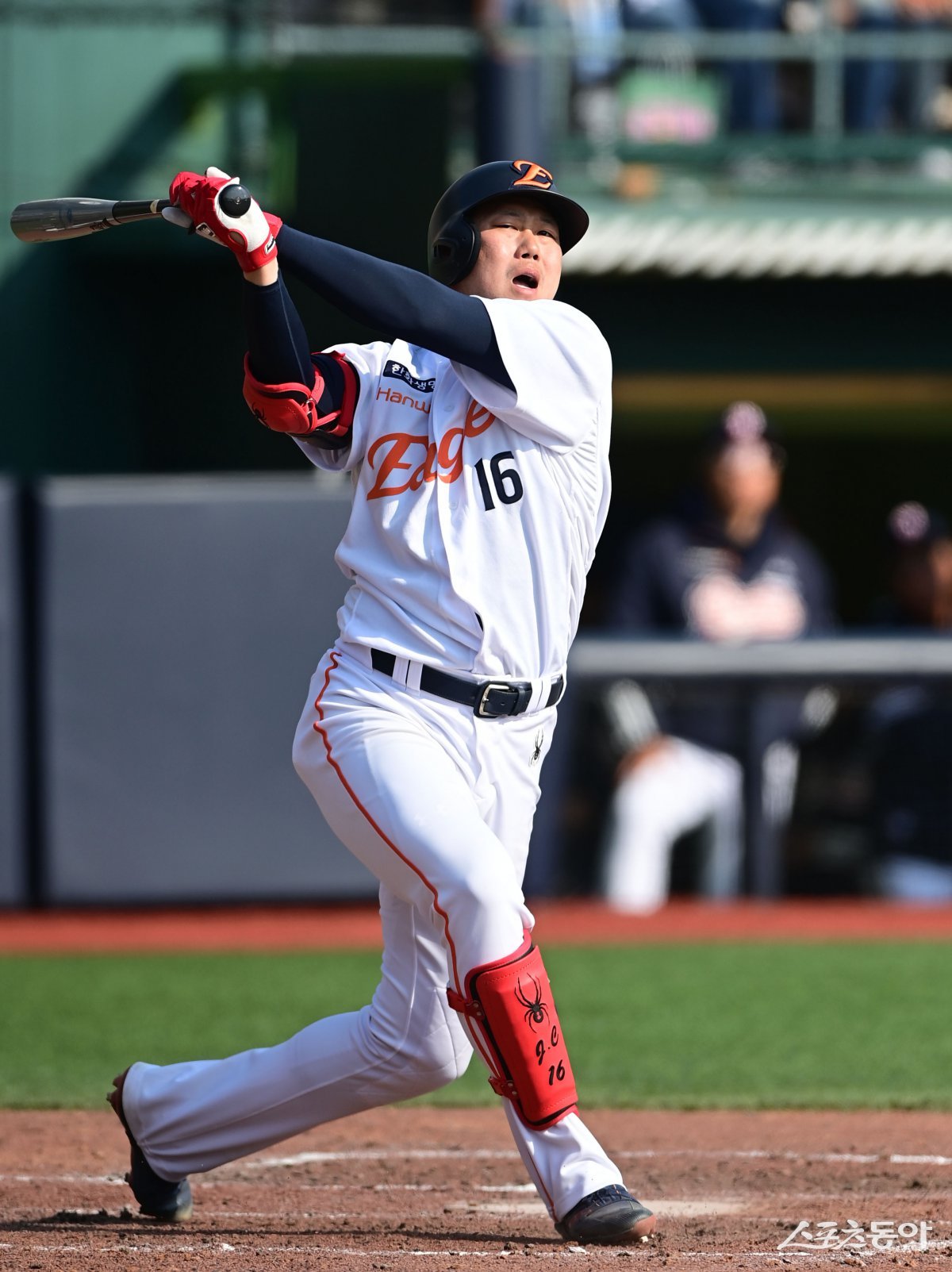 9일 청주야구장에서 열린 ‘2025 신한 SOL Bank KBO리그’ 한화와 두산의 시범경기에서 9회말 2사 1루 한화 하주석이 타격을 하고 있다. 청주 | 주현희 기자 teth1147@donga.com