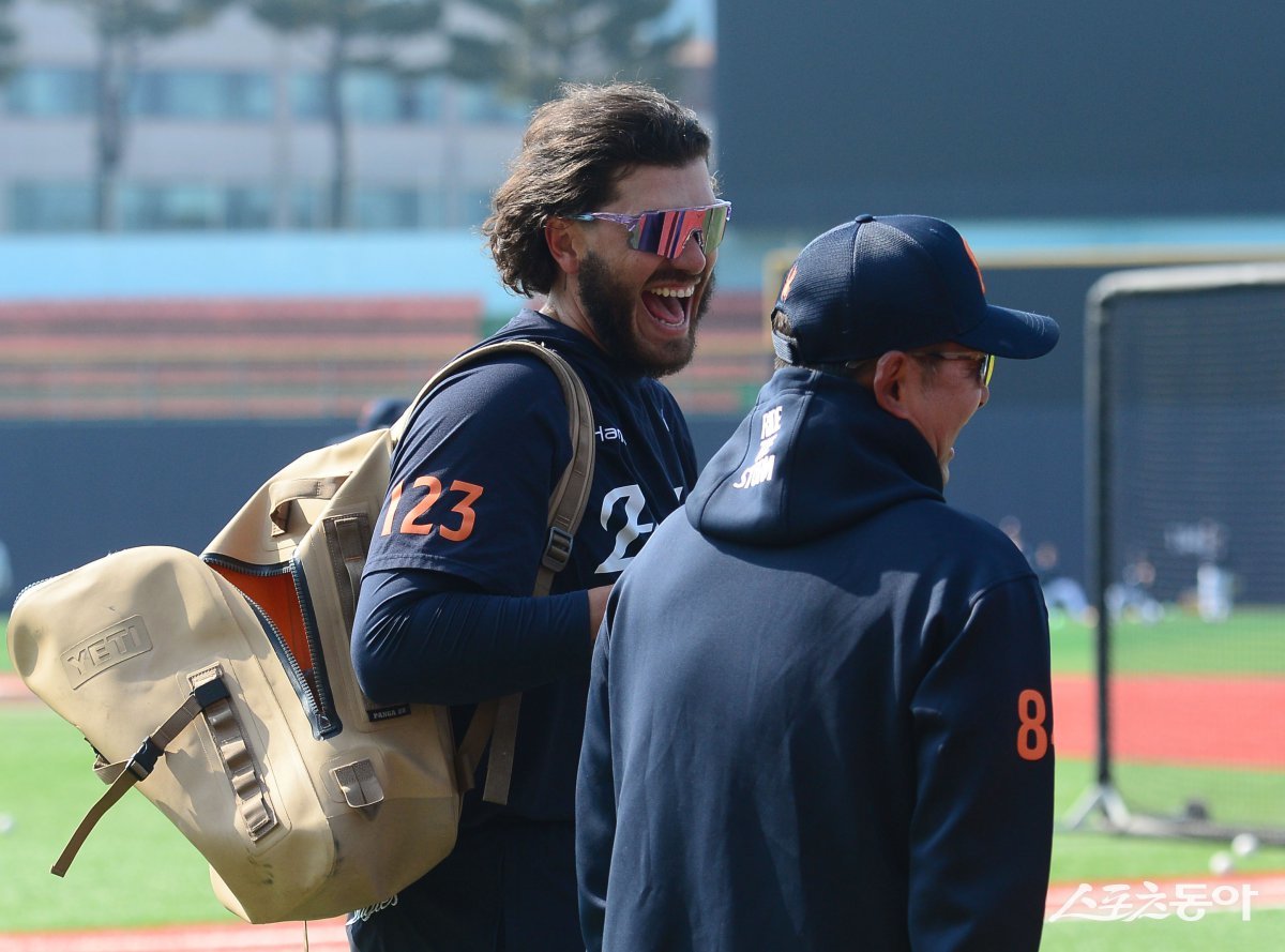 9일 청주야구장에서 열린 ‘2025 신한 SOL Bank KBO리그’ 한화와 두산의 시범경기에 앞서 한화 폰세가 코치와 이야기하고 있다. 청주 | 주현희 기자 teth1147@donga.com