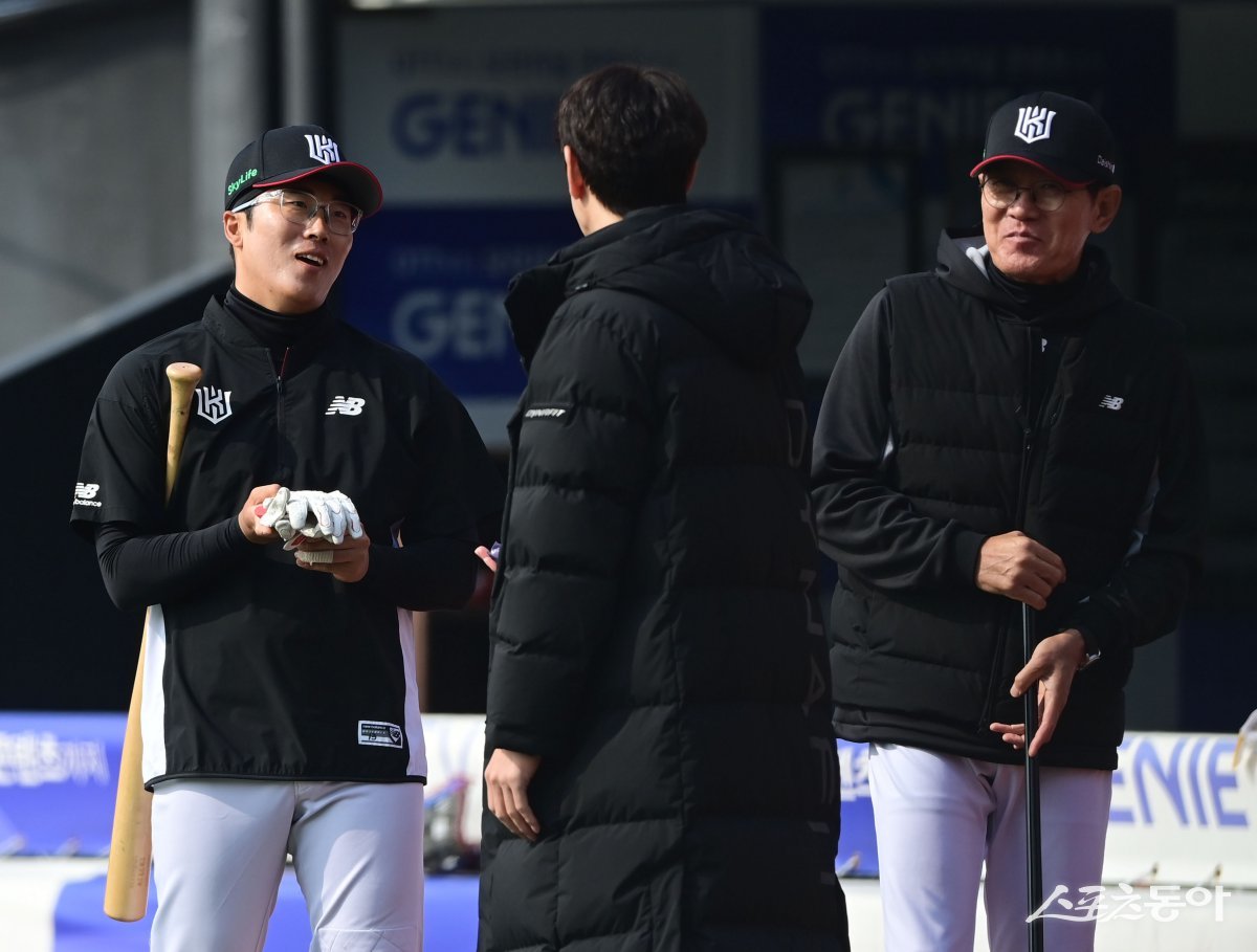 10일 수원KT위즈파크에서 열린 ‘2025 신한 SOL Bank KBO리그’ 키움과 KT의 시범경기에 앞서 KT 허경민과 이강철 감독이 이야기를 하고 있다. 수원 | 주현희 기자 teth1147@donga.com