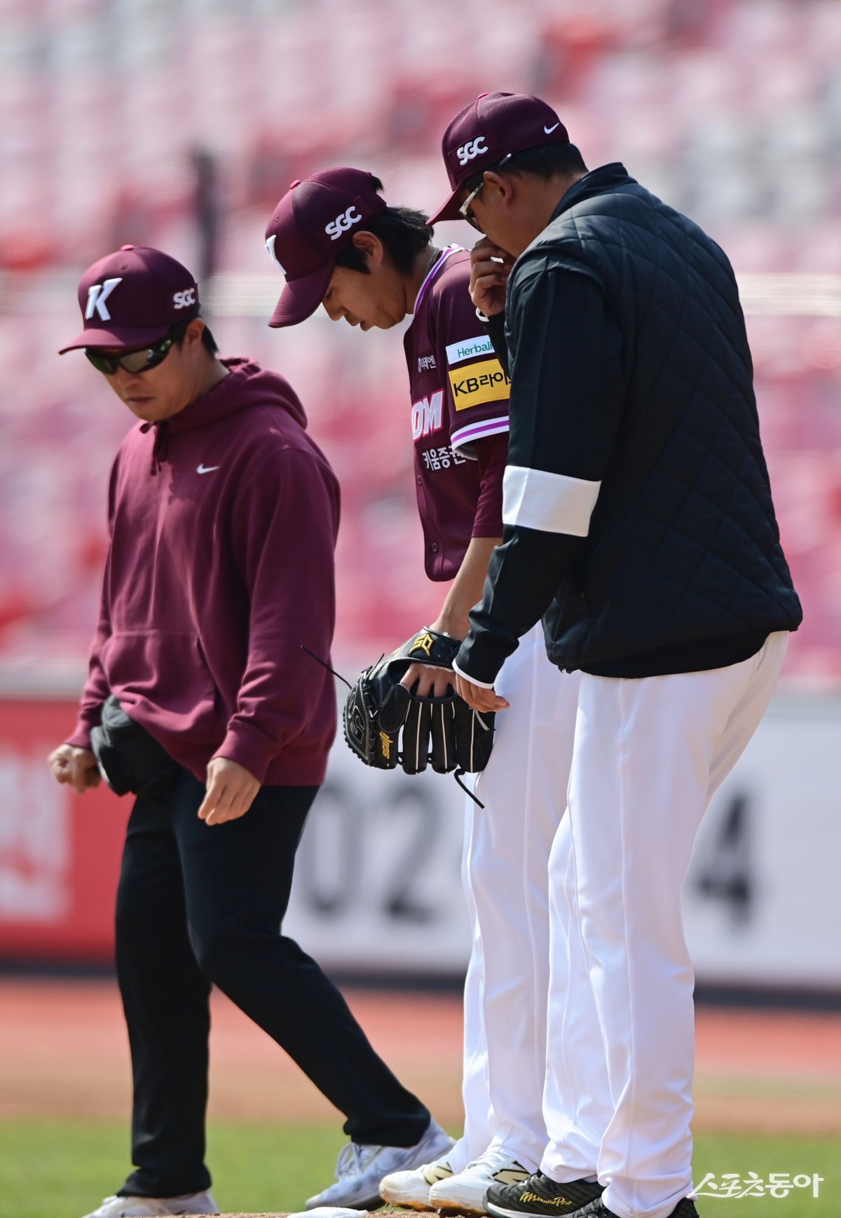 10일 수원KT위즈파크에서 열린 ‘2025 신한 SOL Bank KBO리그’ 키움과 KT의 시범경기에서 3회말 2사 상황에서 타구에 맞은 키움 선발 투수 하영민이 상태를 확인하고 있다. 수원 | 주현희 기자 teth1147@donga.com