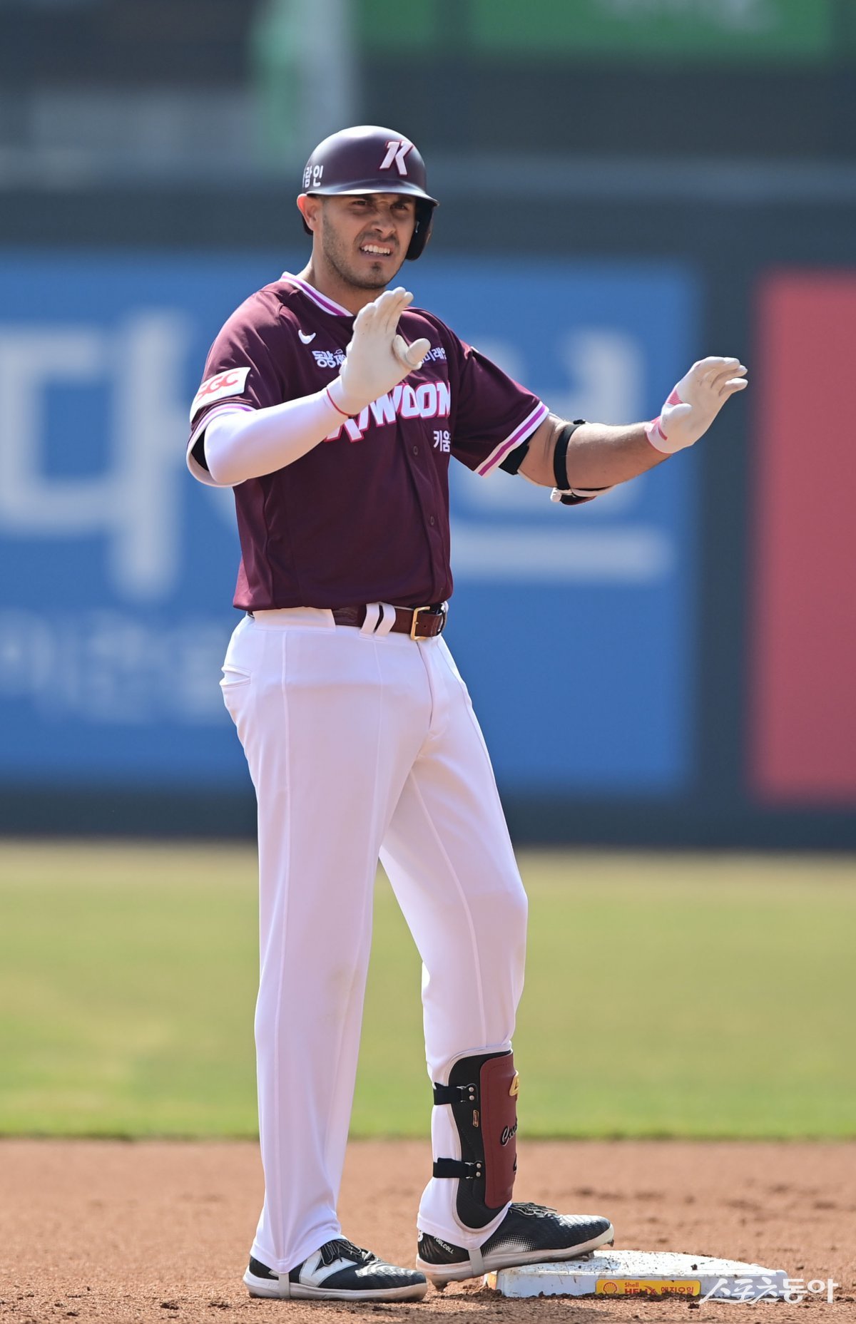 10일 수원KT위즈파크에서 열린 ‘2025 신한 SOL Bank KBO리그’ 키움과 KT의 시범경기에서 3회초 1사 1, 2루 키움 카디네스가 1타점 우전 2루타를 친 후 세리머니를 하고 있다. 수원 | 주현희 기자 teth1147@donga.com