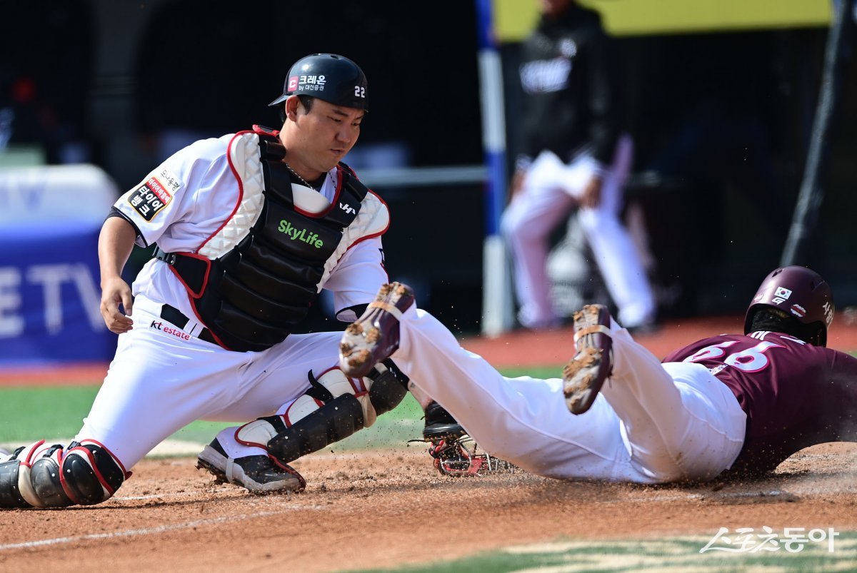 10일 수원KT위즈파크에서 열린 ‘2025 신한 SOL Bank KBO리그’ 키움과 KT의 시범경기에서 3회초 1사 2, 3루 키움의 땅볼 때 KT 장성우가 3루주자에게 실점하고 있다. 수원 | 주현희 기자 teth1147@donga.com