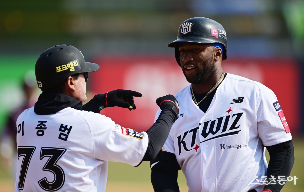 10일 수원KT위즈파크에서 열린 ‘2025 신한 SOL Bank KBO리그’ 키움과 KT의 시범경기에서 4회말 무사 1루 KT 로하스가 3연타석 안타를 친 후 1루코치로부터 교체 사인을 받고 있다. 수원 | 주현희 기자 teth1147@donga.com