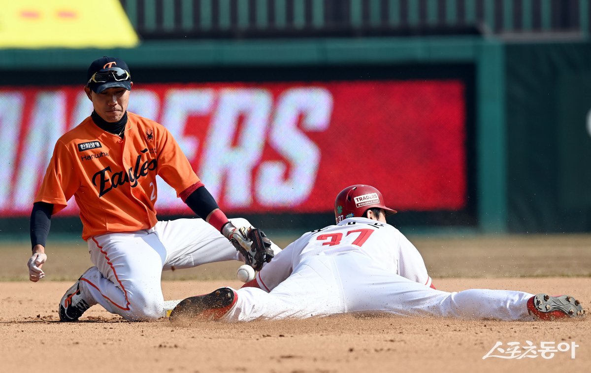 10일 인천 SSG 랜더스필드에서 SSG 랜더스와 한화 이길스의 시범 경기가 열렸다. 6회말 2사 1루에서 SSG 오태곤이 2루 도루를 성공하고 있다. 인천 | 김민성 기자 marineboy@donga.com