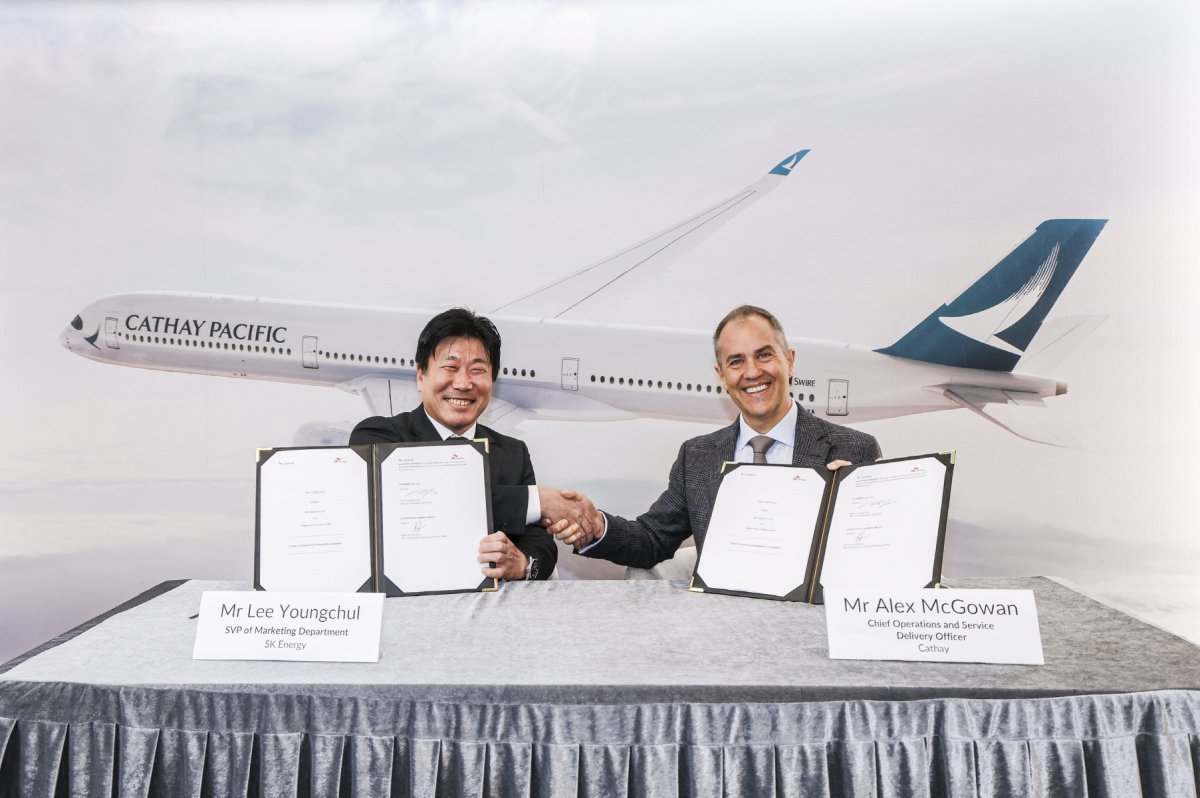 이영철 SK에너지 마케팅본부장(왼쪽)과 알렉스 맥고완 캐세이퍼시픽항공 운영 및 서비스 제공 최고 책임자(오른쪽)가10일 홍콩 캐세이퍼시픽항공 본사에서 SAF 공급 계약을 체결하고 있다. 사진제공 |SK이노베이션