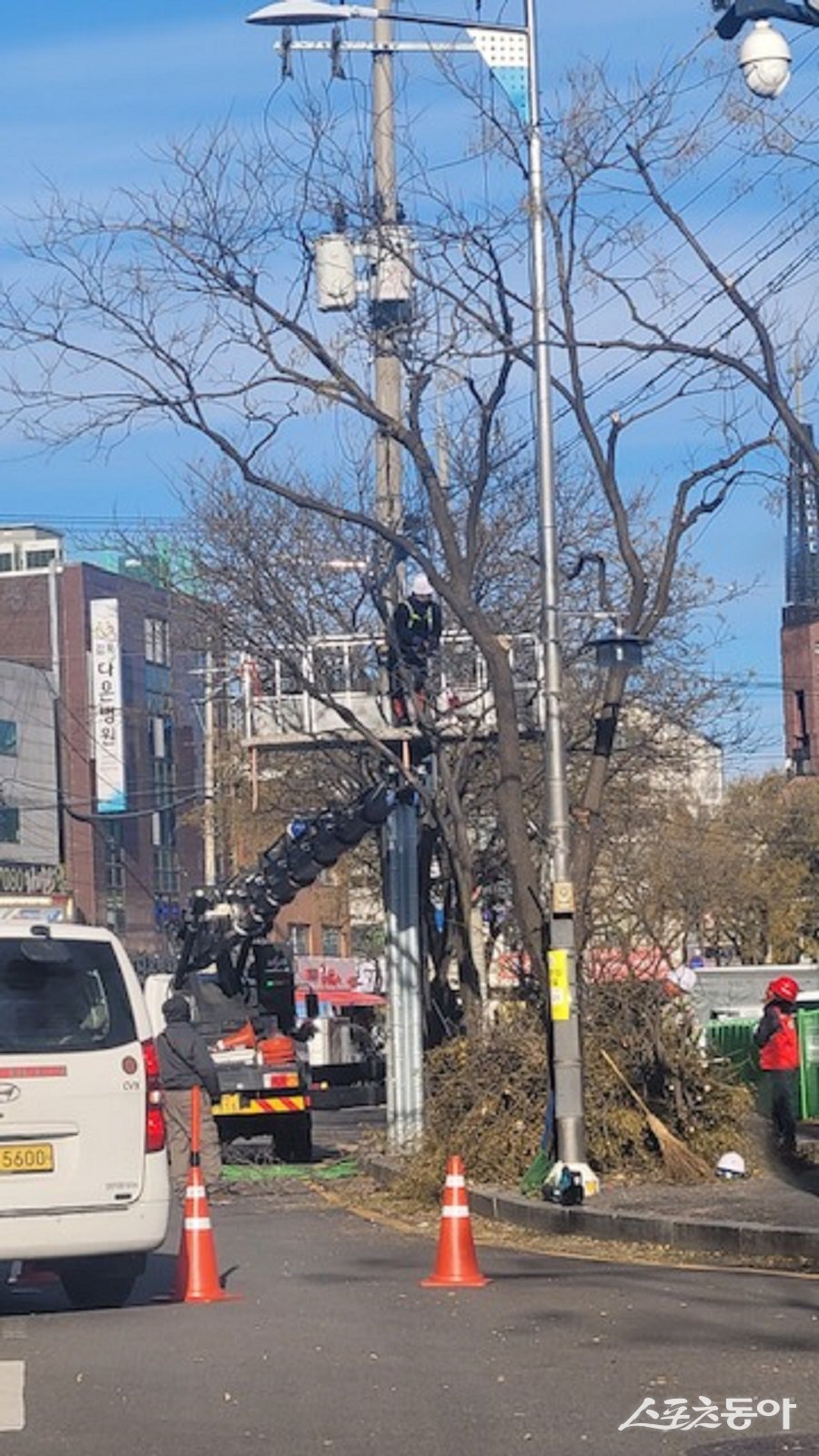 김포시, 돌문로 회화나무 가지치기 작업을 진행하고 있다. 사진제공|김포시청