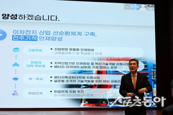 이강덕 포항시장이 올해 초 신년 기자회견에서 이차전지 산업과 연계한 맞춤형 인재 양성에 대한 계획을 설명하고 있다. 사진제공|포항시