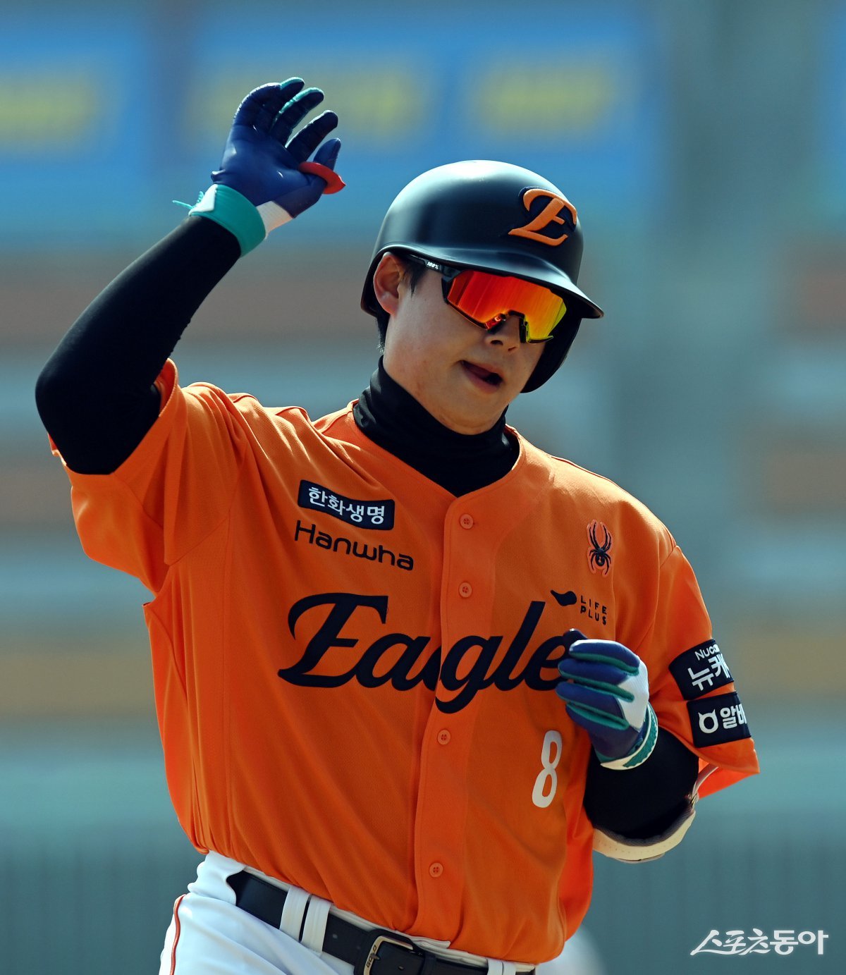 11일 인천 SSG 랜더스필드에서 SSG 랜더스와 한화 이글스의 시범 경기가 열렸다. 4회초 2사 1, 2루에서 한화 노시환이 스리런 홈런을 쏘아 올린 후 그라운드를 돌며 환호하고 있다. 인천 | 김민성 기자 marineboy@donga.com