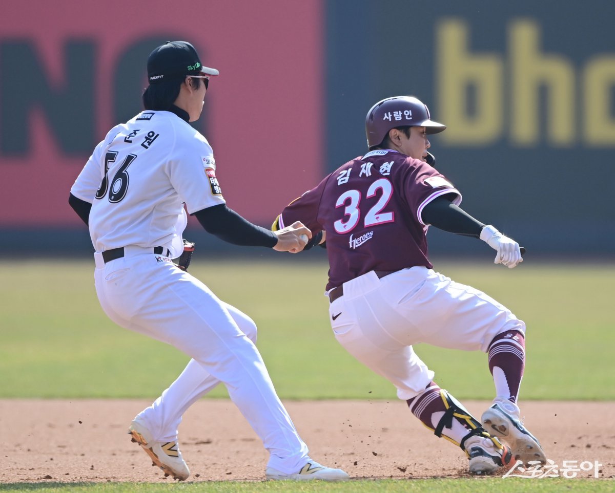 11일 수원KT위즈파크에서 열린 ‘2025 신한 SOL Bank KBO리그’ 키움과 KT의 시범경기에서 7회초 1사 1, 3루 키움 김재현이 좌전 안타를 친 후 KT 장준원을 피해 주루 플레이를 하고 있다. 수원 | 주현희 기자 teth1147@donga.com