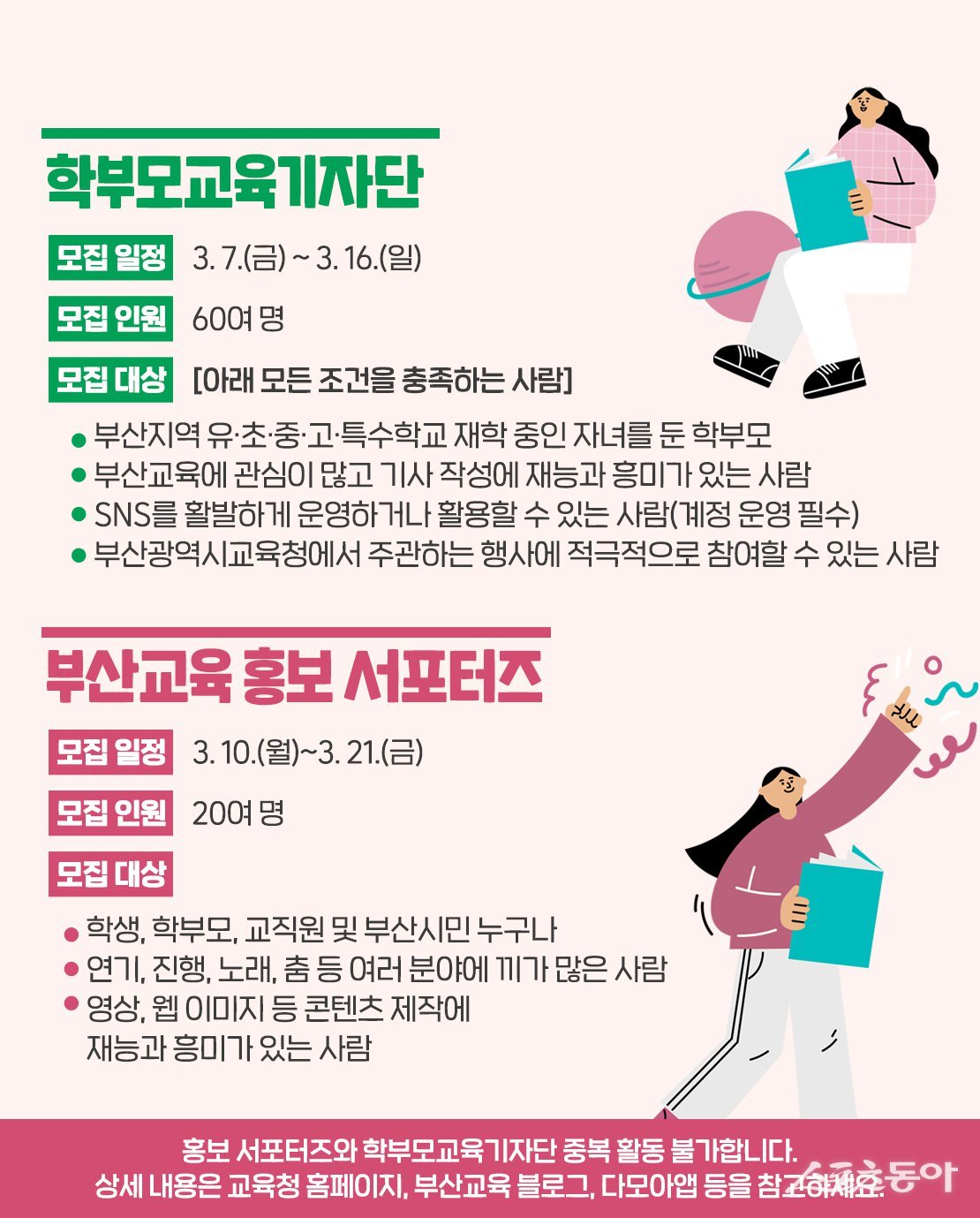 부산시교육청이 부산교육 현장소식을 생동감 있게 전달할 ‘학부모 교육기자단’ 60여명과 홍보 콘텐츠 제작에 참여할 ‘부산교육 홍보 서포터즈’ 20여명 등 총 80여명을 모집 중이라고 11일 밝혔다.