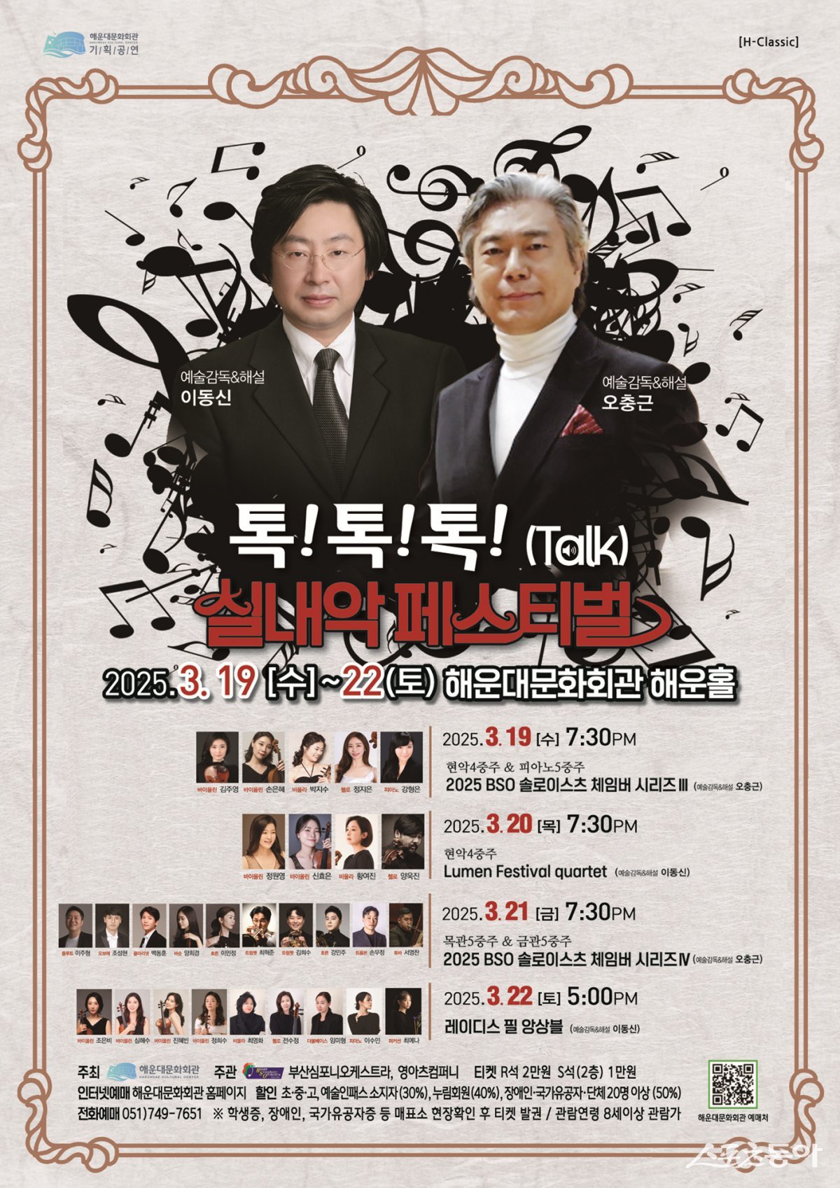해운대문화회관이 부산에서 활발히 활동하는 실내악 연주자들의 음악 향연인 ‘톡!톡!톡(Talk) 실내악 페스티벌’을 19~22일 해운홀에서 연다.