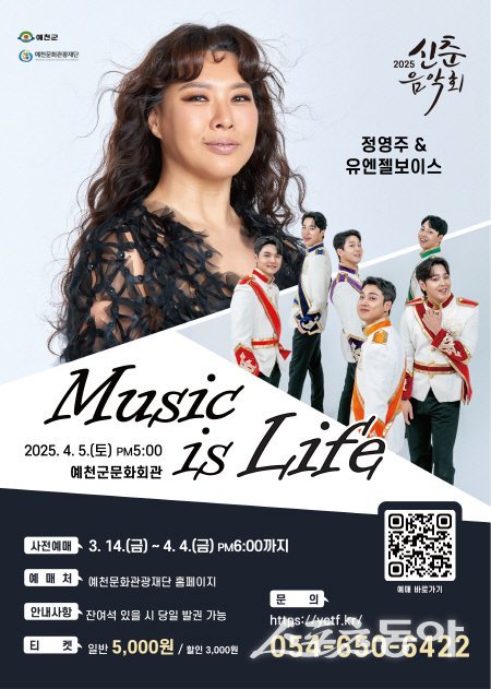 예천군과 예천문화관광재단은 오는 4월 5일 오후 5시 예천군문화회관에서 ‘신춘음악회(정영주&유엔젤보이스)’를 군민에게 선보인다.예천군민의 문화‧예술의 중심지로 자리 잡은 예천군문화회관은 올해 양질의 문화‧예술 콘텐츠를 제공하며 다양한 공연을 선보일 계획으로, 2025년 상반기 ‘신춘음악회(정영주&유엔젤보이스)’로 기획공연의 첫 포문을 연다.