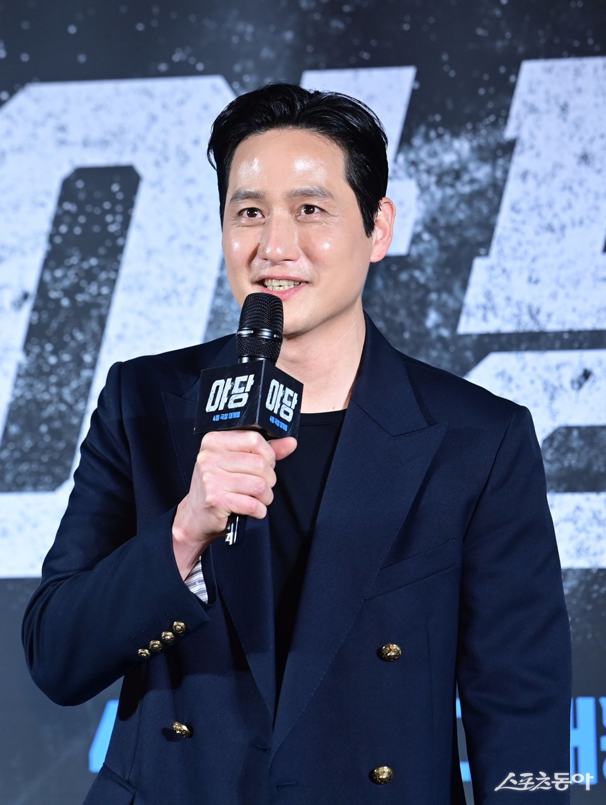 배우 박해준이 13일 서울 강남구 메가막스 코엑스점에서 열린 영화 ‘야당’ 제작보고회에서 인사말을 하고 있다. 주현희 기자 teth1147@donga.com