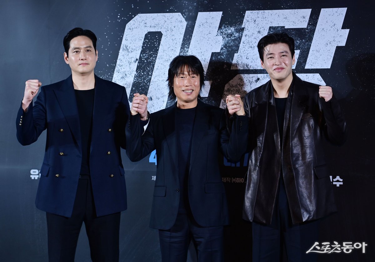 배우 박해준, 유해진-강하늘이 13일 서울 강남구 메가막스 코엑스점에서 열린 영화 ‘야당’ 제작보고회에서 포즈를 취하고 있다. 주현희 기자 teth1147@donga.com