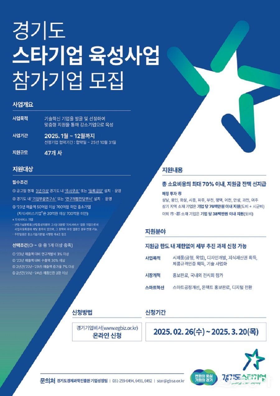 ‘스타기업 육성사업’은 성장 가능성이 높은 기술혁신 및 수출주도 중소기업을 선정해 강소·중견기업으로 도약할 수 있도록 지원하는 사업이다. 시는 경기도경제과학진흥원과 함께 총 47개 기업을 지원하기 위해 기술혁신 기업을 발굴하고 맞춤형 지원을 통해 강소기업으로 육성할 계획이다.