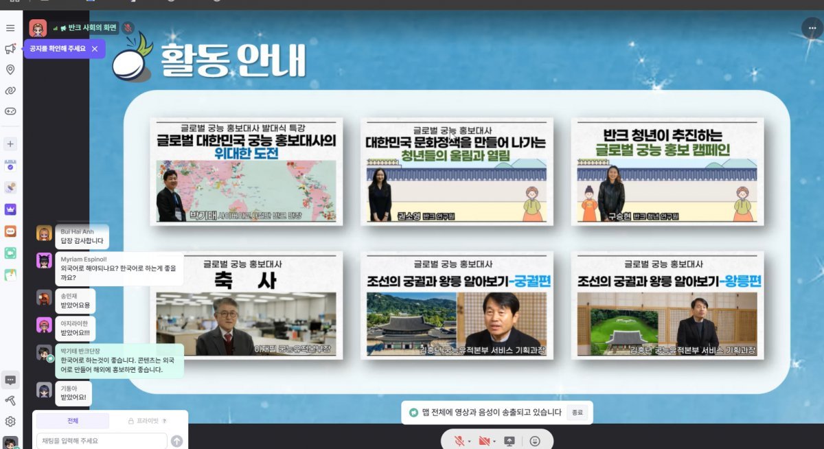 사이버외교사절단 반크는 궁능유적본부와 협력하여, 청소년과 청년을 대상으로 우리의 궁궐과 왕릉을 세계에 알릴 ‘글로벌 궁능 홍보대사’를 양성한다. 반크는 176명의 청소년과 청년을 선발하여 ‘글로벌 궁능 홍보대사’로 임명했다. 이들은 3월 14일 메타버스에서 열린 발대식을 통해 공식적인 활동을 시작했다.