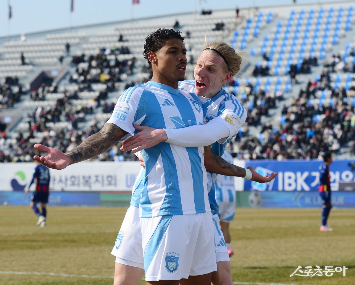 16일 수원종합운동장에서 열린 ‘하나은행 K리그1 2025’ 수원FC와 울산 HD FC의 경기에서 울산 에릭이 동점골을 성공시킨 후 세리머니를 하고 있다. 수원 | 주현희 기자 teth1147@donga.com