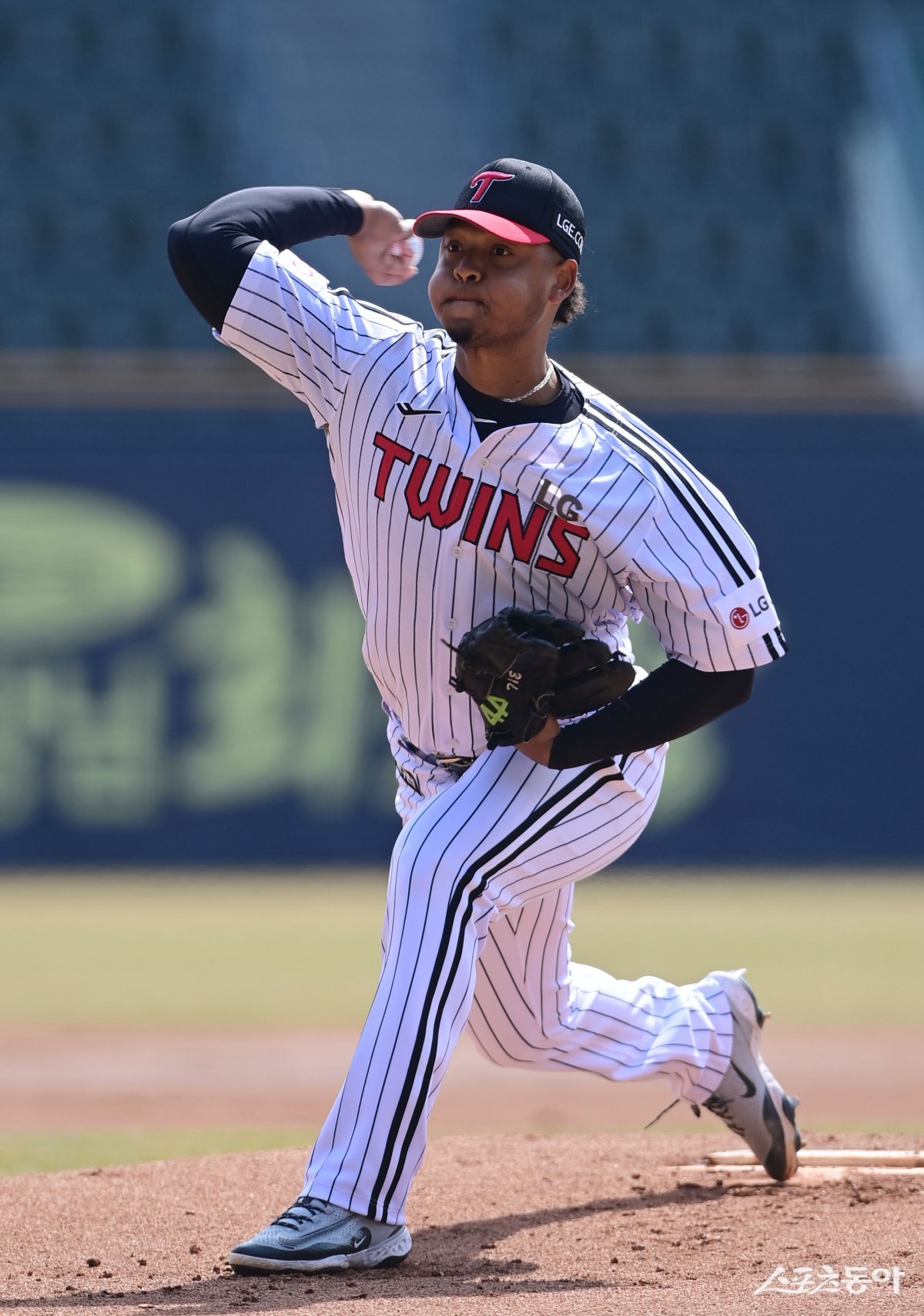 17일 서울 잠실야구장에서 열린 ‘2025 신한 SOL Bank KBO리그’ NC 다이노스와 LG 트윈스의 시범경기에서 LG 선발 투수 에르난데스가 마운드에 올라 역투하고 있다. 잠실 | 주현희 기자 teth1147@donga.com