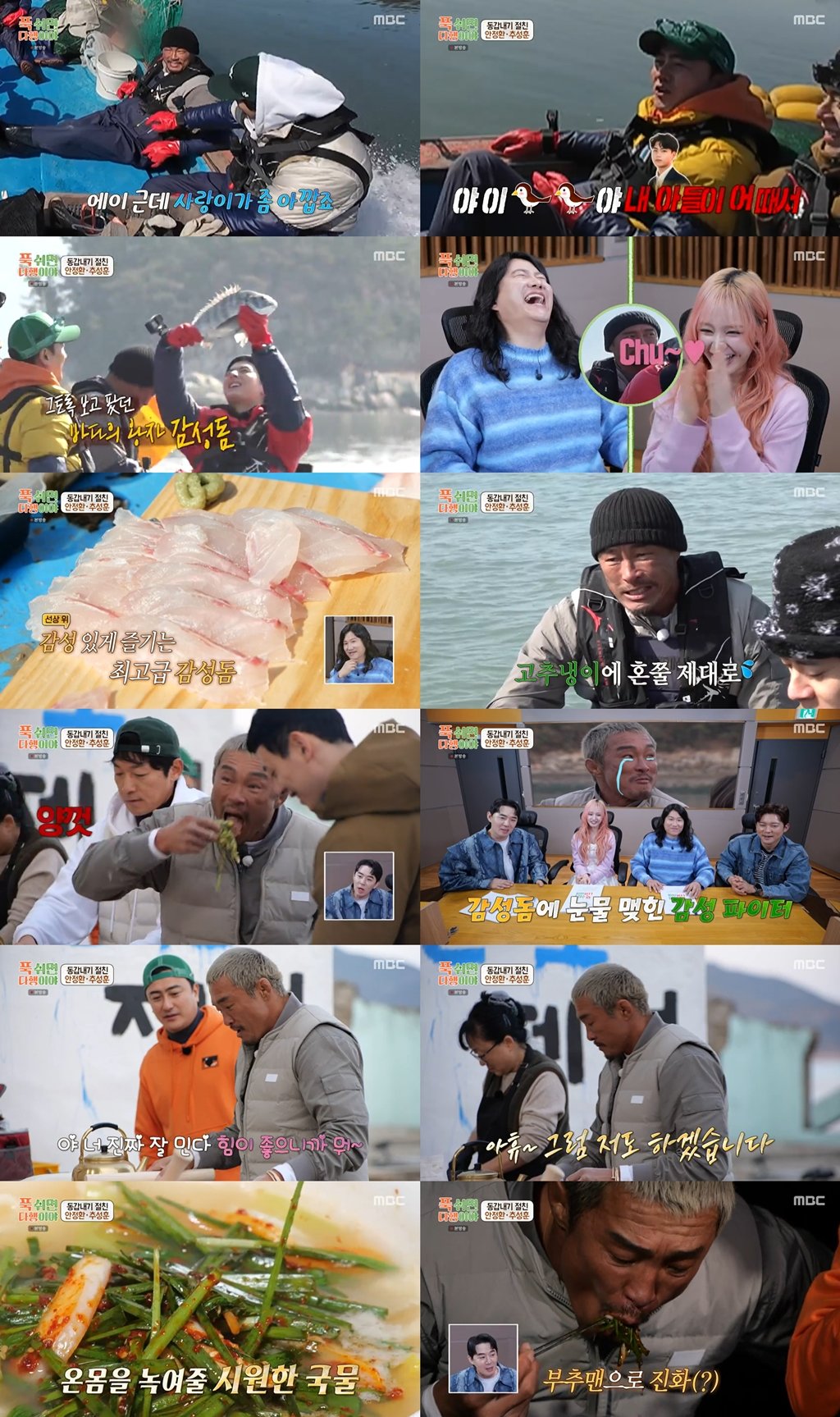 감성돔 만선 이후 배 위에서는 선장님이 갓 잡은 생선을 바로 회로 썰어주는 ‘배마카세’가 열렸다. 두툼한 감성돔 회를 맛본 안정환은 “이건 미슐랭 받아야 해”라며 극찬했고, 추성훈도 “진짜 맛있네”라며 감탄했다. 이어 추성훈은 모두의 만류에도 “나는 괜찮아”라며 회에 과하게 고추냉이를 올리는 남다른 먹방을 선보였다. 결국 시뻘게진 얼굴로 물을 찾는 추성훈을 보며 모두가 유쾌한 웃음을 터뜨렸다.