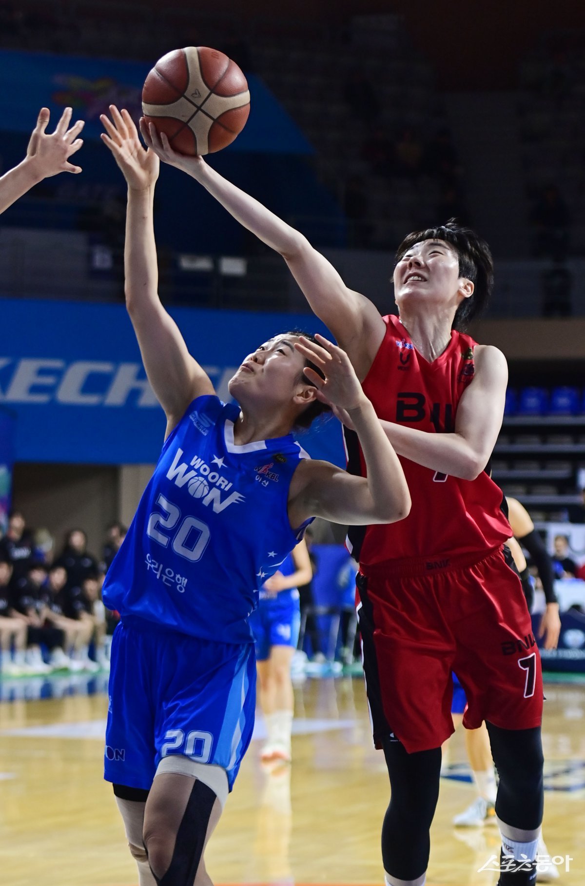 18일 충남 아산이순신체육관에서 열린 ‘하나은행 2024-2025 여자프로농구 포스트시즌’ 챔피언결정전 1차전 우리은행과 BNK썸의 경기에서 우리은행 이명관과 BNK썸 박혜진이 리바운드 경합을 하고 있다. 아산 | 주현희 기자 teth1147@donga.com