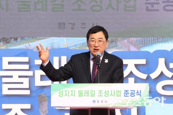 주낙영 경주시장이 성지지 둘레길 조성사업 준공식에서 인사말을 하고 있다. 사진제공 ㅣ 경주시