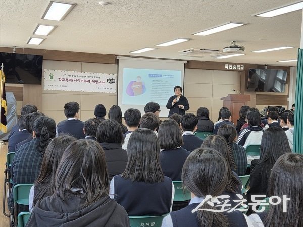 울진군 청소년 상담복지센터는 18일 죽변초, 죽변중, 한국 원자력마이스터고 학생 243명을 대상으로 학교폭력예방(사이버폭력) 교육을 실시했다.학교폭력예방 교육은 청소년들 사이에 사이버폭력의 비중이 점차 증가하는 추세에 맞춰 사이버폭력 예방과 대처 방안 등을 배우는 것을 목적으로 하고 있다.